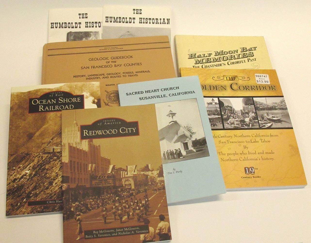 Sacred Hear Church in Susanville, Golden Corridor, Humboldt Historian by Bell and Brooks (2), Redwood City, Ocean Shore Railroad, Half Moon Bay Memories by Morrall, Geological Guidebook of the San Francisco Bay Counties by Division of Mines. Date: Location: California HWAC# 571946