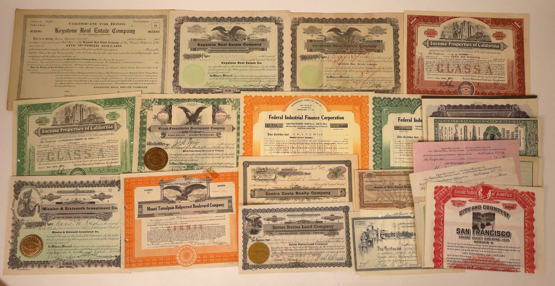 Lot of 23, most different. Includes: Keystone Real Estate Co. (SF, unissued 1909 bond); City & County of San Francisco Cherry Valley Dam Bond (1949); Contra Costa Realty Co. (1917); Empire Building & Loan Association (1930); Sutter Buttes Land Co. (1937); San Francisco Women's Building Assoc. (1925 bond); Alameda Park Co. (1926 bond); Wickham Havens Inc. (1927 uniss bond); Mount Tamalpais Ridgecrest Boulevard Co. (1930); Madison Realty Co. (1911); Gamma of Delta Gamma House Assoc. (1936); Mission & Sixteenth Invest Co. (1926); and more. Please inspect.