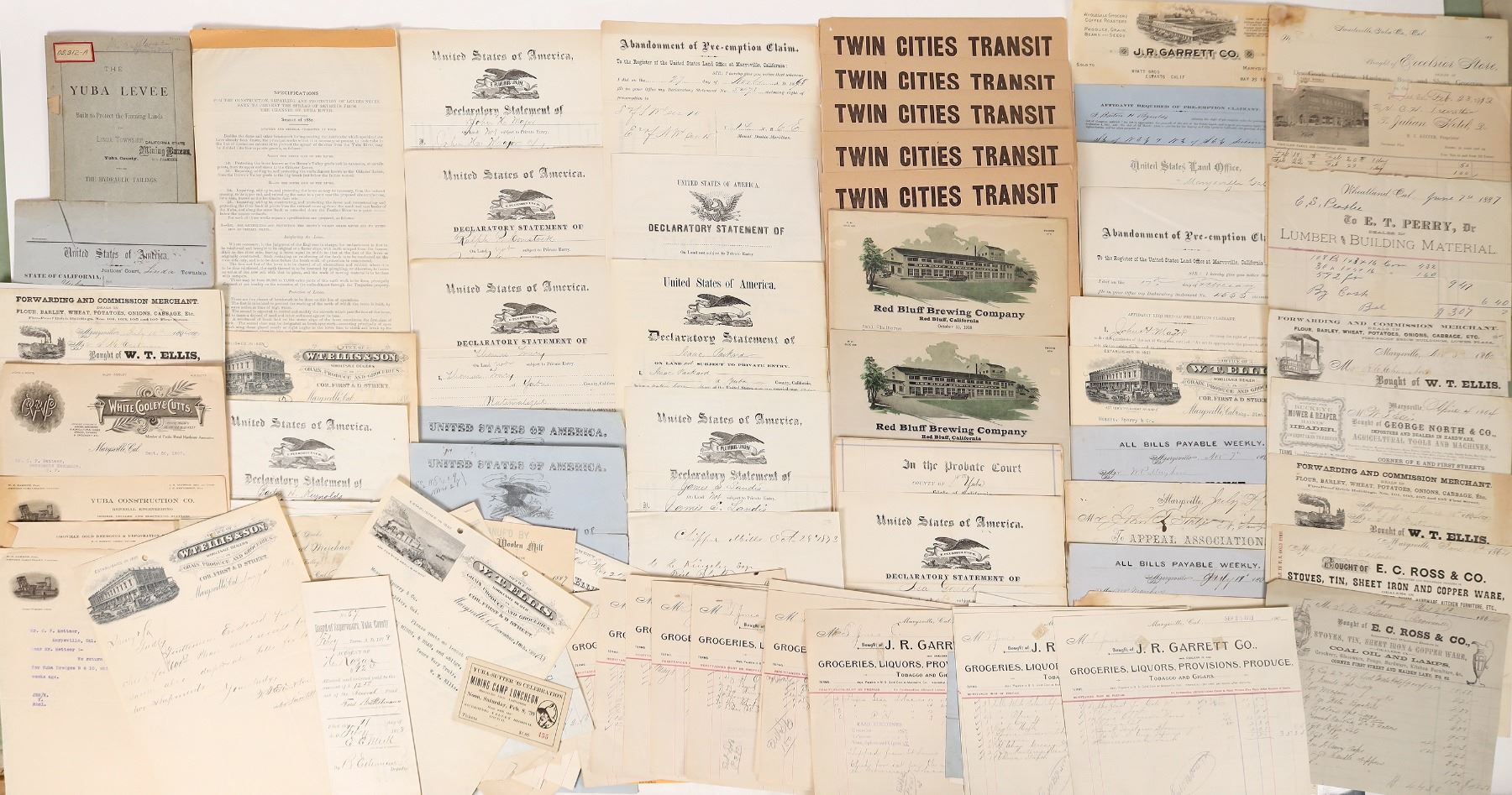 About 50 pieces of ephemera from Northern California, mostly older. 1860's Billheads, letterheads, several Twin Cities Transit broadsides 1942, affidavits, pictorial Red Bluff Brewing letterheads, Western Hotel cover etc. Red Bluff, Yuba County, Marysville, Willows, Smartsville, Wheatland etc. Northern Counties California