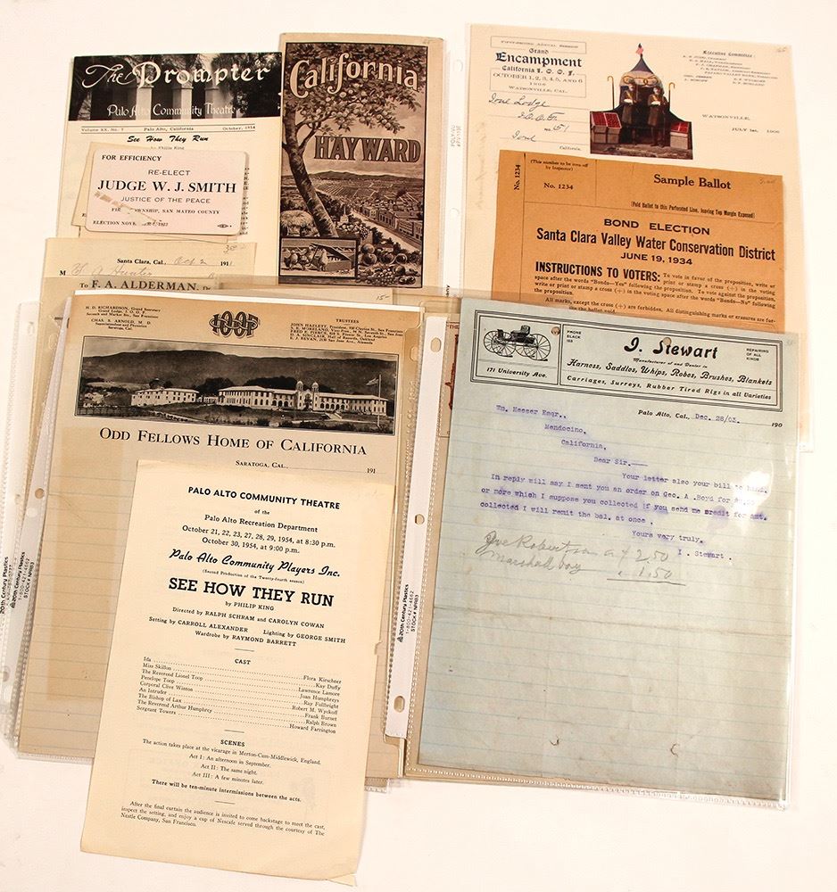 Palo Alto Community Theatre 1954 program. Pictorial letterheads from C L Best Tractor, J Stewart Saddles, Thomas W Alton plumbing, Odd Fellows Home of Calif., Calif. Apple Show, Palace Hotel. Re-elect Judge WJ Smith cards, Hayward agro folder and map with tear, 3 mailers from Palo Alto Community Theatre Date: Location: Santa Clara/Santa Cruz/Stanford, California HWAC# 54913