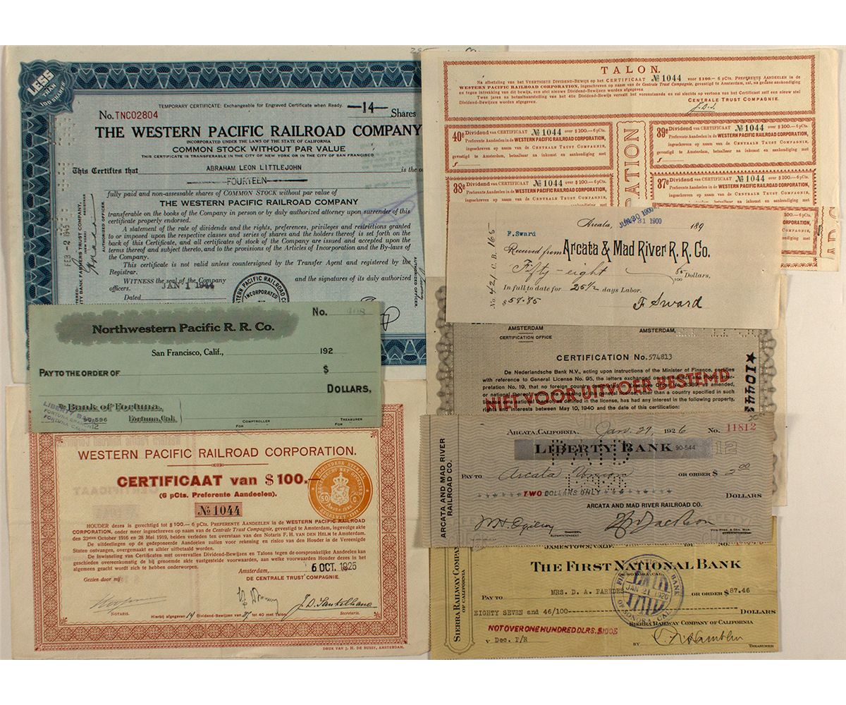 Lot of six: 1) Check, Arcata & Mad River R.R. Co., dated 1900. 2) Check, Sierra Railway Company of California, Jamestown Cal., dated 1920. 3) Unissued check, Northwestern Pacific R.R. Co., dated 192-. 4) Amsterdam Certificate, Western Pacific Railroad ad Corporation, dated 1925. 5) Check, Arcata and Mad River Railroad Co. Arcata, Cal., dated 1926. 6) Stock, The Western Pacific Railroad Company, dated 1944. (Toth V&T collection)City: County: State: CADate: