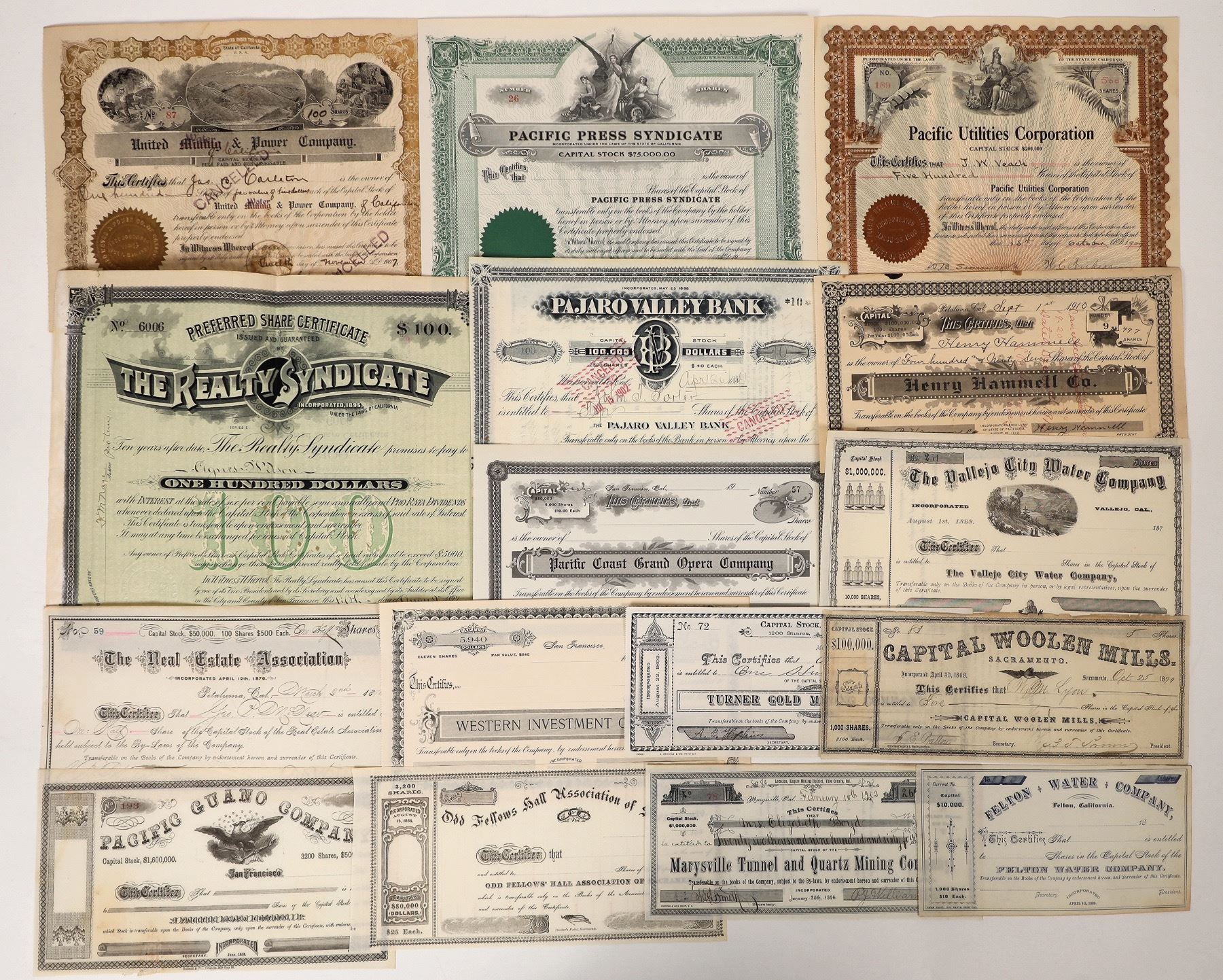 Stock certificates (15) from various entities in Northern California. Included is The Felton Water Company, Capital Woolen Mills, Pacific Utilities Corporation, Pajaro Valley Bank, Pacific Coast Grand Opera Company, Pacific Press Syndicate and more. Some are issued, some are blank. Please see photos for more details.