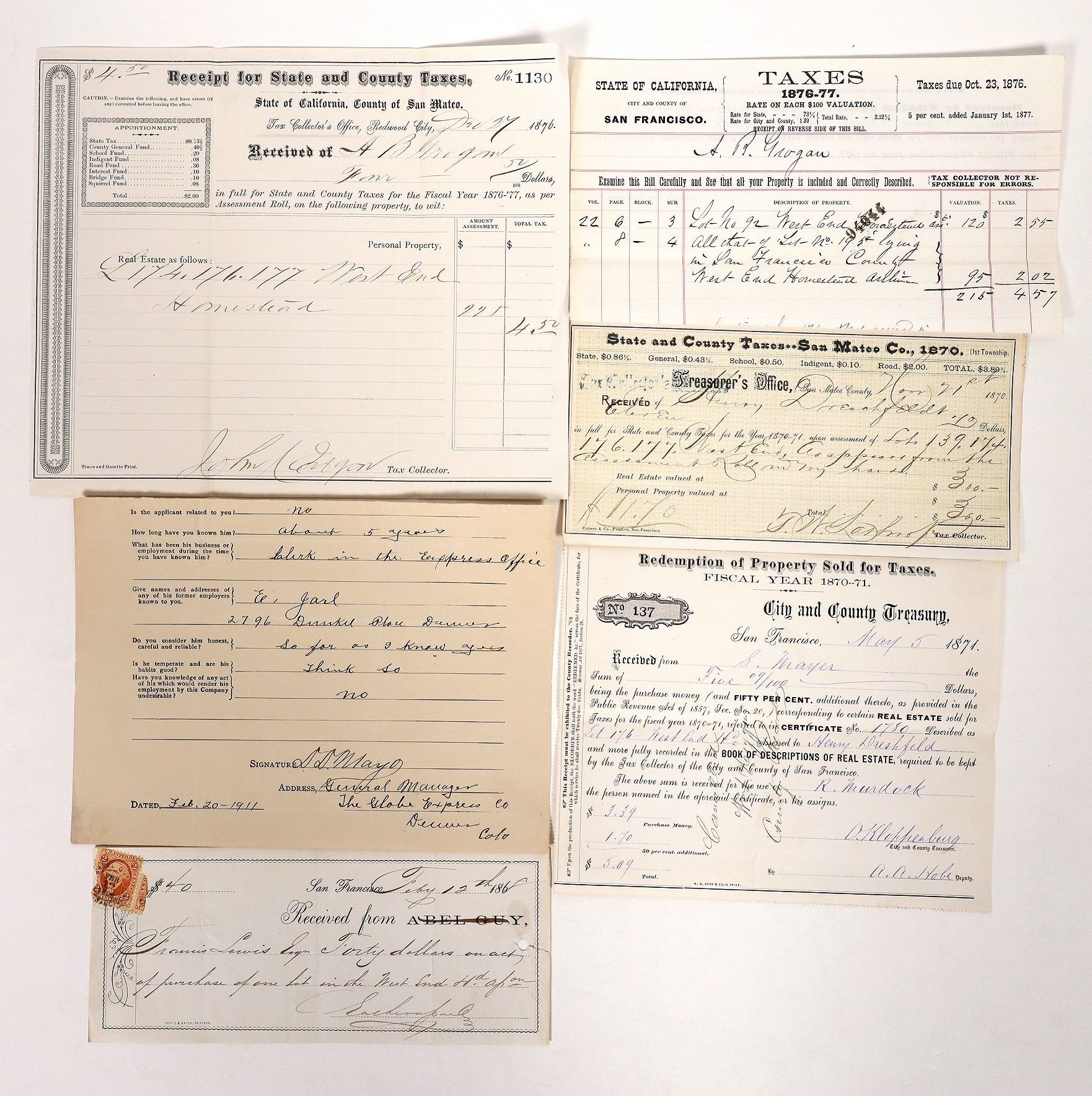 6 c. 1868-1911 Northern California tax statements. San Mateo Co., San Francisco etc.