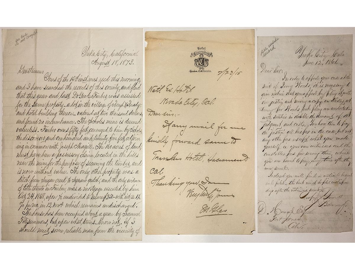 Three old letters: 1) Yreka City, 1861, a Fort Jones lawyer addressing claims against Perry Woods; 2) 2/23/15 Nat'l Ex. Hotel Nevada City; 3) first page of an 1873 letter from Yreka City.