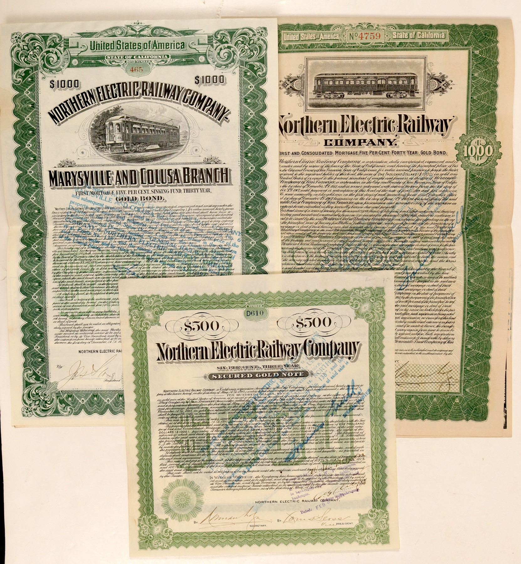 Three bonds Northern Electric Railway Co. 1907, Calif. 1. #D610, I/C, $500 6% Three Years Secured Gold Note bearer note. Issued May 1, 1911 signed Louis Seoss President, GREEN. Embossed seal, no vignette. Stamped notes of bankruptcy sale. Britton & Rey printer. EF.