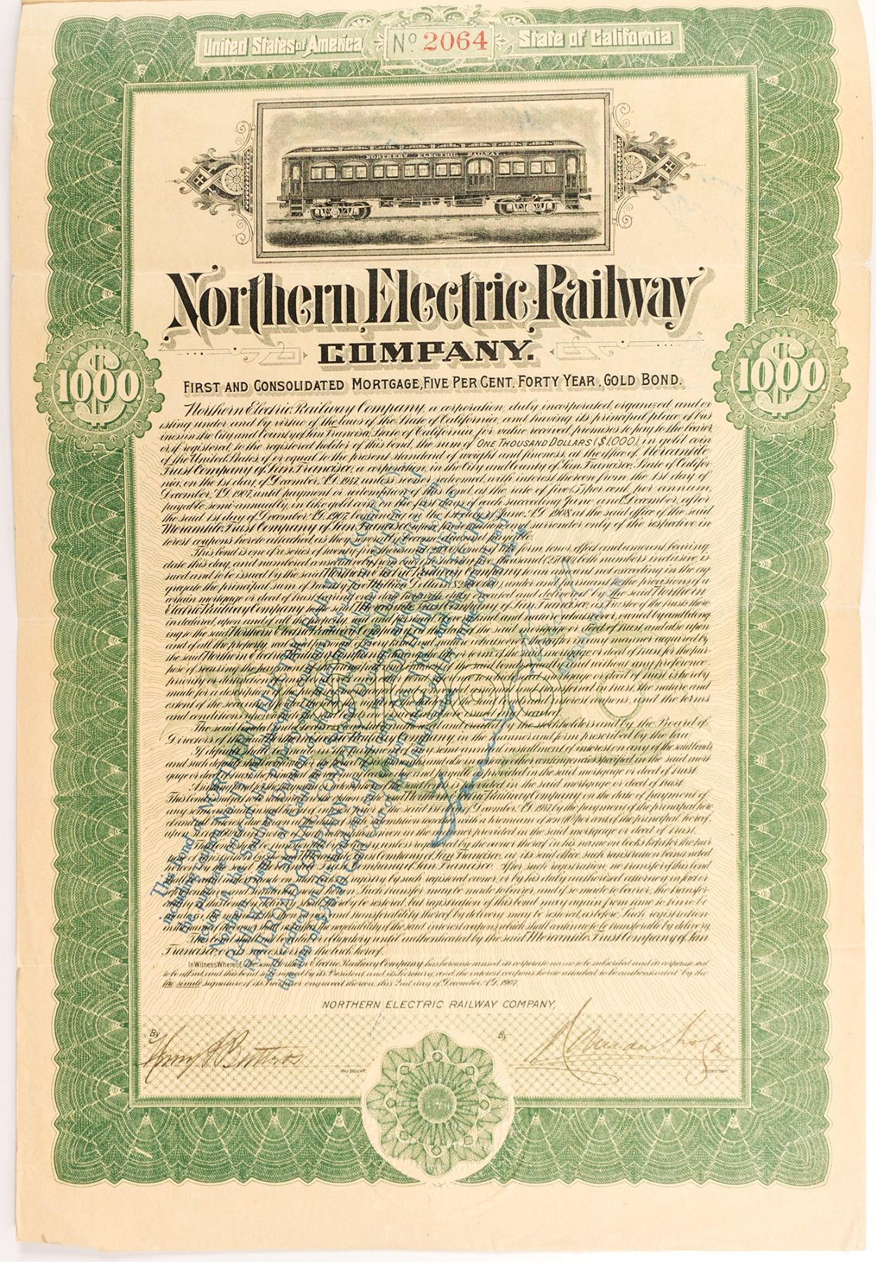 Bond #2064 , green $1000 5% forty year bond. Signed by president. #2064. Rare. This bond includes coupon #13 in payment of another rail line. Sacramento north through the agricultural Sacramento Valley to Marysville-Yuba City and Chico from late 1905 to 1918. It became the Northern Division of the SNRy.