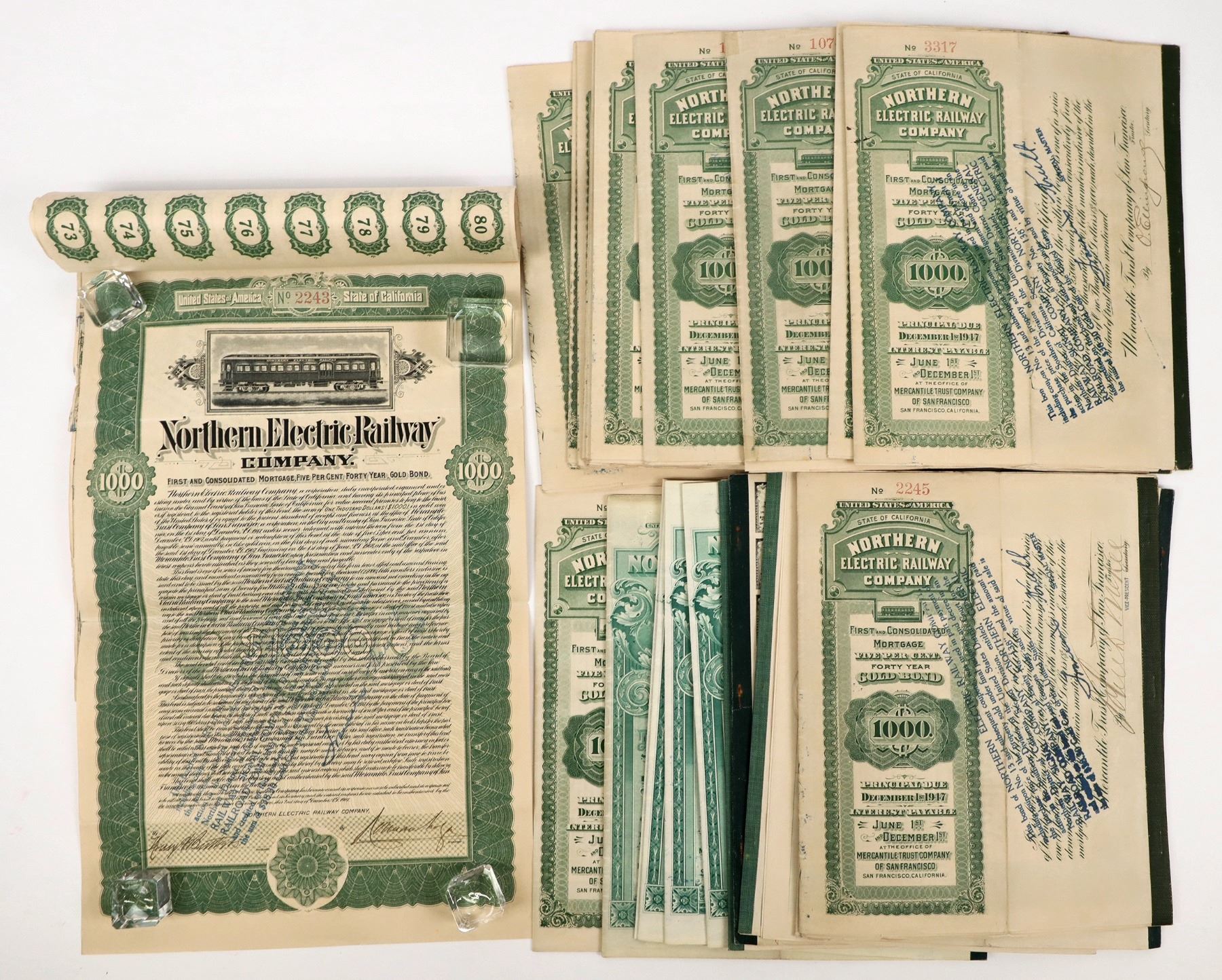 Lot of (24) $1000 certificates, (2) different variations. Dates appear the same (December 1 and June 1) on both, $25 coupons appear similar also. "First and Consolidated Mortgage, Five Per Cent, Forty Year, Gold Bond" is indicated under the name. Bind strips are a different shade of green, and cancel stamps are straight or angled, depending on the version. Embossed seals, some coupons redeemed. (2) pages of coupons on these, with page one (12) each, typical. Condition is good to very good, please see photos.