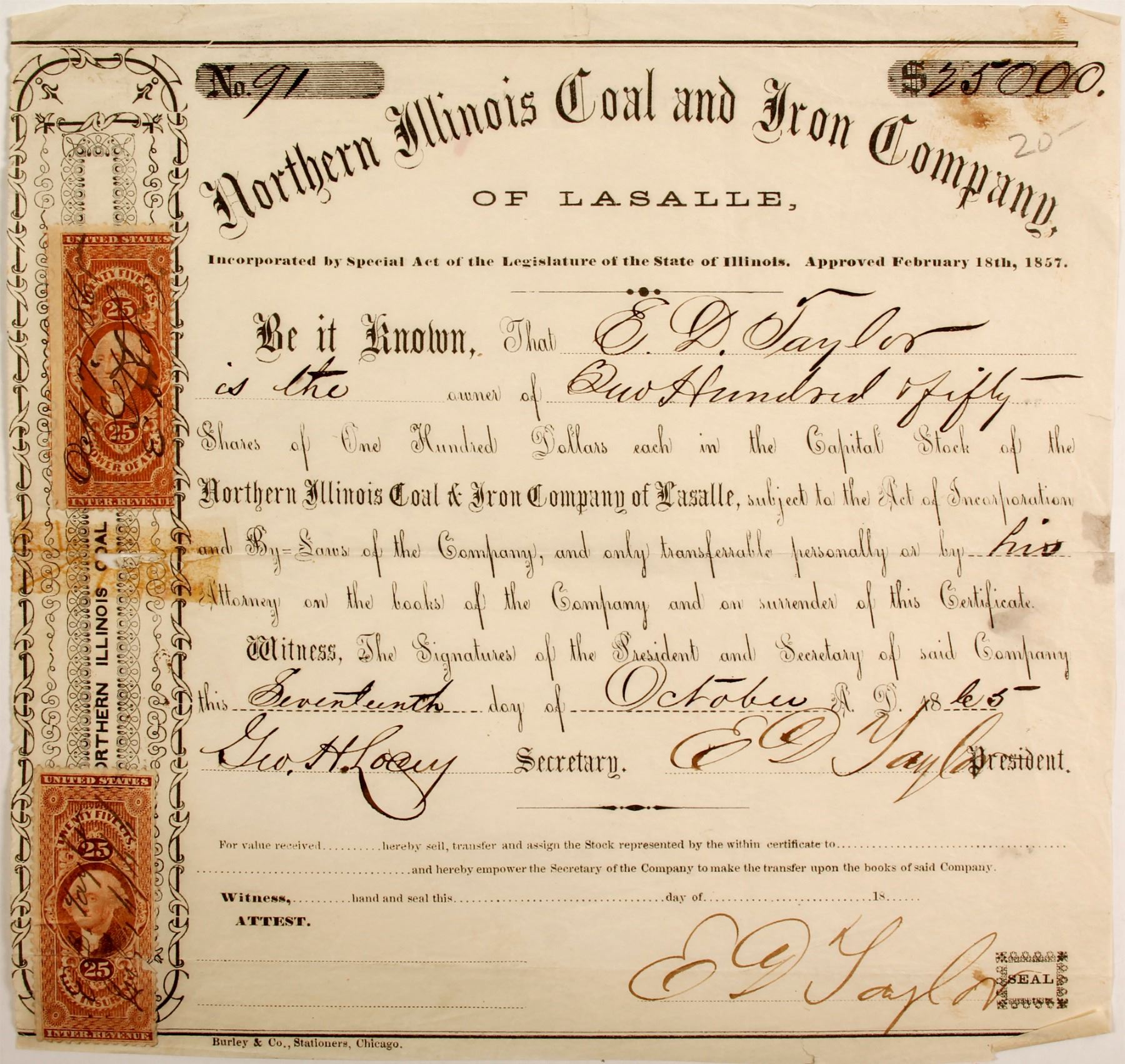 # 91 for 250 shares to ED Taylor. Signed by president Taylor and secretary George H Locry(?). Dateline 1865. Incorporated Feb 18, 1857. Not Cancelled. Two 25c Revenue stamps: life insurance and power of att'y. Fragile onion skin. Taped on back and bled through front. Dog ears, rips and tears. Foxing. Still, most of the stock is in good condition. Burley & Company of Chicago printer. By the fall of 1856 the Northern Illinois had opened a mine in the LaSalle area. [Worthen]. Signed by and issued to Colonel ED Taylor who is considered the Father of the present day Greenback. He is also the only person to ever defeat Abraham Lincoln in the Illinois 1832 state legislature election. Prag Collection State: Illinois City: LaSalle Date: 1865 HWAC# 81954