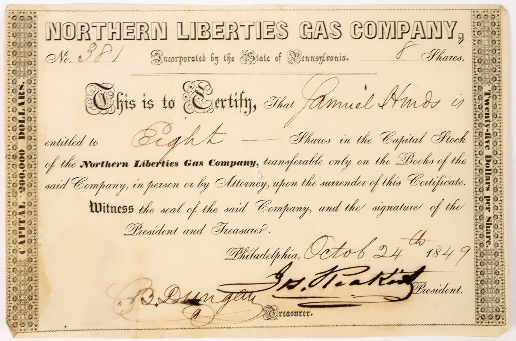 Inc. in PA. No. 381, issued for 8 shares to Samuel Hinds in Philadelphia in 1849. Signed by the president and treasurer. Cut cancelled.