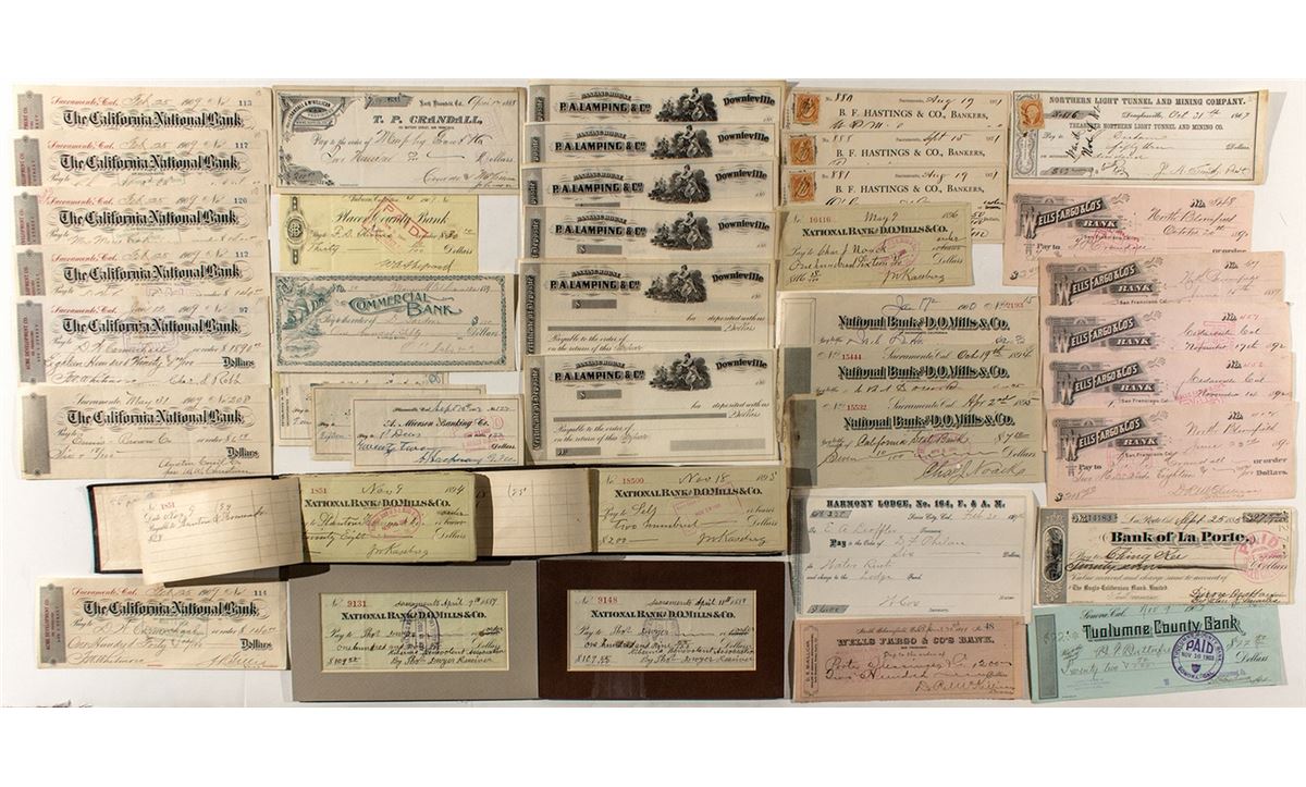 Lot of 50+ items. Includes: six unused pictorial Certificates of Deposit from the Banking House of P.A. Lamping & Co. (Downieville); an 1867 check from Northern Light Tunnel and Mining Company, w/ adhesive revenue (Douglasville); two used checkbooks from National Bank of D.O. Mills & Co., 1894-1896, plus loose checks (Sacramento); seven Acme Development checks, 1909 (Sacramento); three 1871 B.F. Hastings & Co. (Sacramento); Harmony Lodge receipt, 1916 (Sierra City); two 1892 Wells Fargo (Cedarville); four Wells Fargo (1889-1891) and T.P. Crandall 1881 (all North Bloomfield); three 1903 checks A. Mierson Banking Co. (Placerville); 1903 Tuolumne County Bank (Sonora); and 1901 Placer County Bank (Auburn). (Prag Collection)
