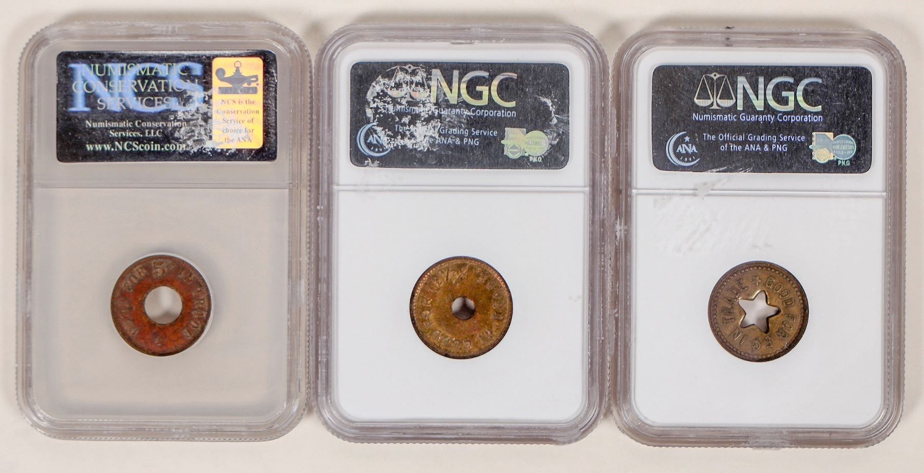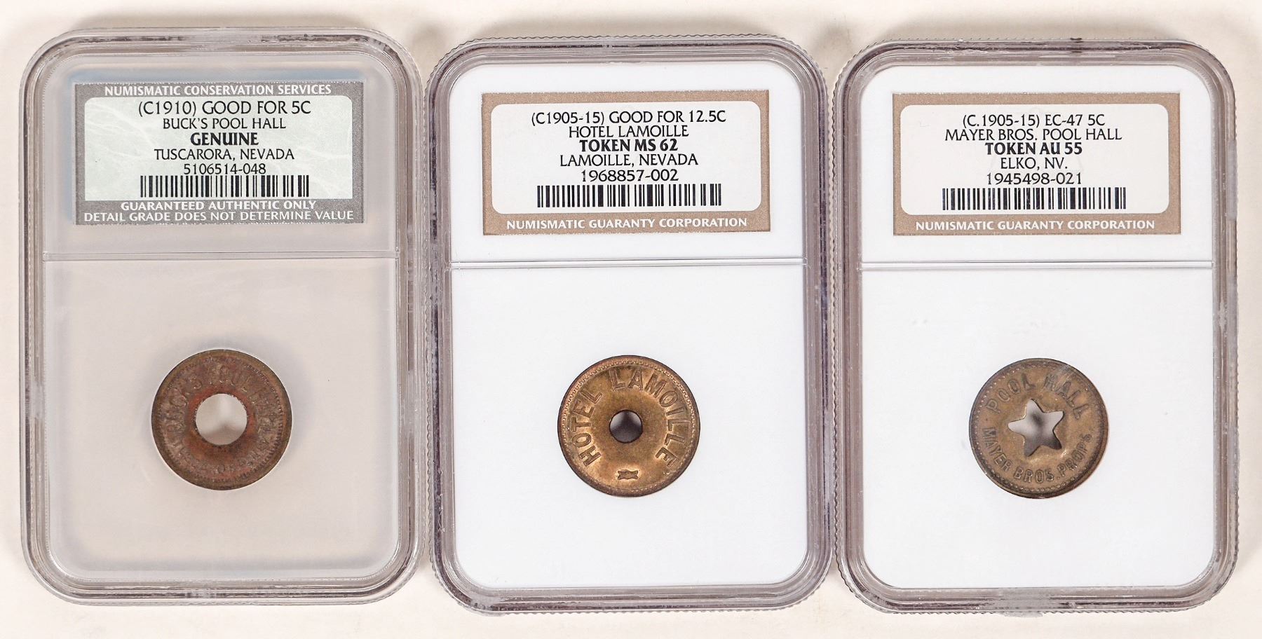 Lot of three tokens in certified holders: 1) NGC MS 62: Hotel Lamoille, Lamoille, GF 12.5c; 2) NGC AU 55: Mayer bros. Pool Hall, Elko, GF 5c; 3) NCS Genuine: Buck's Pool Hall, Tuscarora, GF 5c.