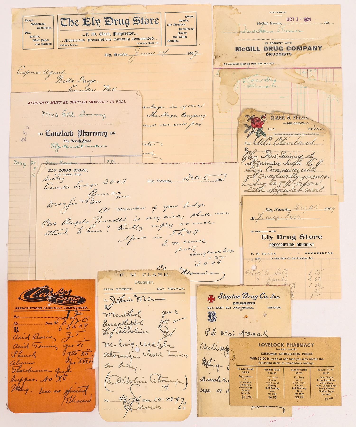 Lot of ten. 1) Ely Drug Store letterhead, FM Clark Proprietor. 1907. 2) Felsenthal & Clark, 1894, Ely. Prescription for quinine!!! 3) McGill Drug Store, 1924, McGill. Half sheet. 4) Steptoe Drug Co., Ely & East Ely. For antiseptic tablets. 5) Lovelock Pharmacy card for Customer Appreciation Policy. 6) Clark's Drug Store prescription sheet. Ely. 7) Lovelock Pharmacy billhead. Etc. [From the Fred Holabird collection. For thorough information on druggist and liquor dealers in Nevada, be sure you get Fred Holabird's books.]