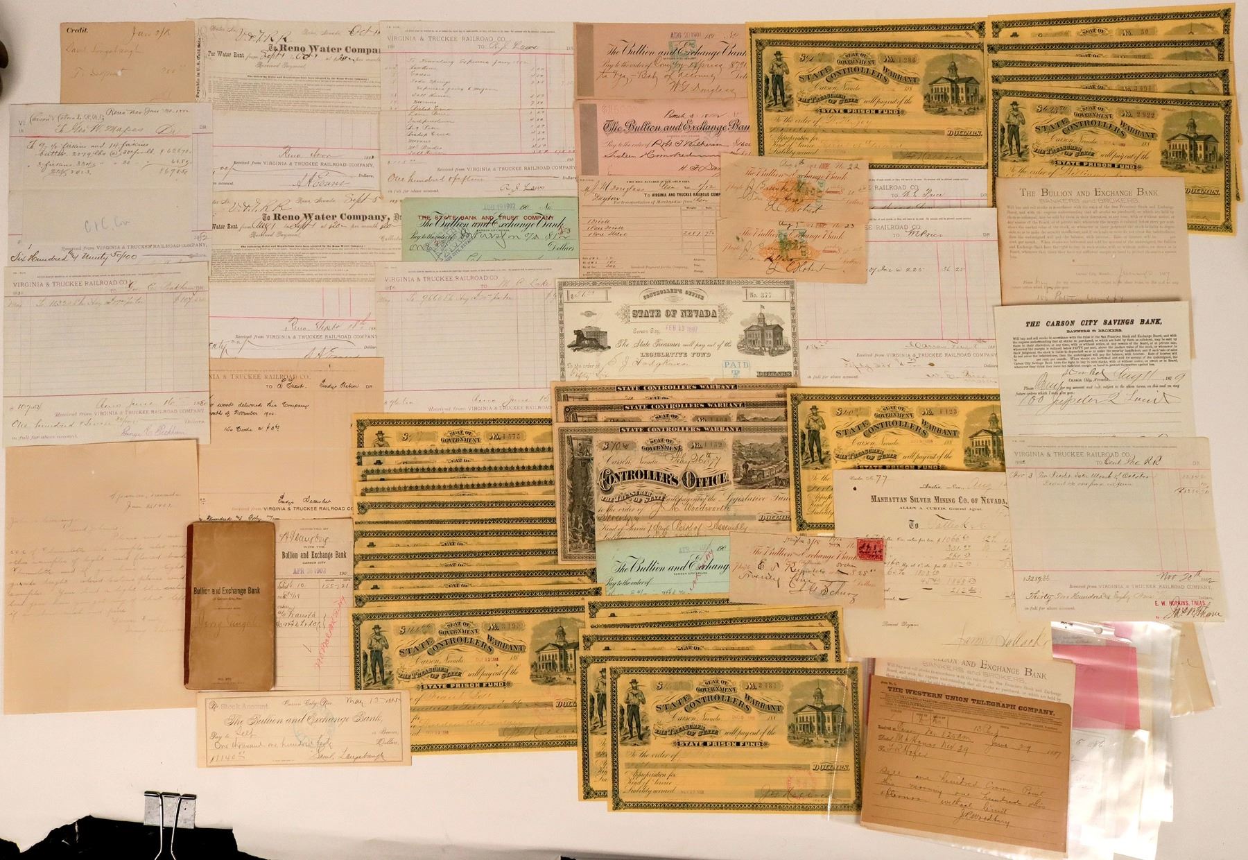 Lot of ~75 documents including checks, bank and railroad vouchers, letters, state warrants, and more that are issued to and/or signed by historical Nevada figures. This collection comes from a major Nevada historian and author. Includes: rare 1880 Lazard Freres Bankers check signed by Adolph Sutro; B&E stock sale from O.R, Leonard, partner with Sutro; four checks signed by Frank Golden (jeweler & hotel owner); Huffaker pieces; Yerington checks & warrant; Millersville, NV receipt; J.D. Ludwig letter (Ludwig, NV, gunfighter); George Nixon pieces (Nixon, NV and partner to Wingfield); Genoa Hot springs letter signed by HJ Walley (Wally's Hot Springs); Sam Davis check (newspaper editor); Dangberg (Dangberg Ranch); Frank Bell; Virginia City check signed by H Berry (Berry Pit Mine in Flowery District); JP Woodbury (Woodbury Mill); various Carson City merchants & Wells Fargo agents; Spencer, NV letter from Mary Spencer; V&T vouchers to Reno place names like Mapes, Evans Creek, Laws, CA, and more. Please inspect!