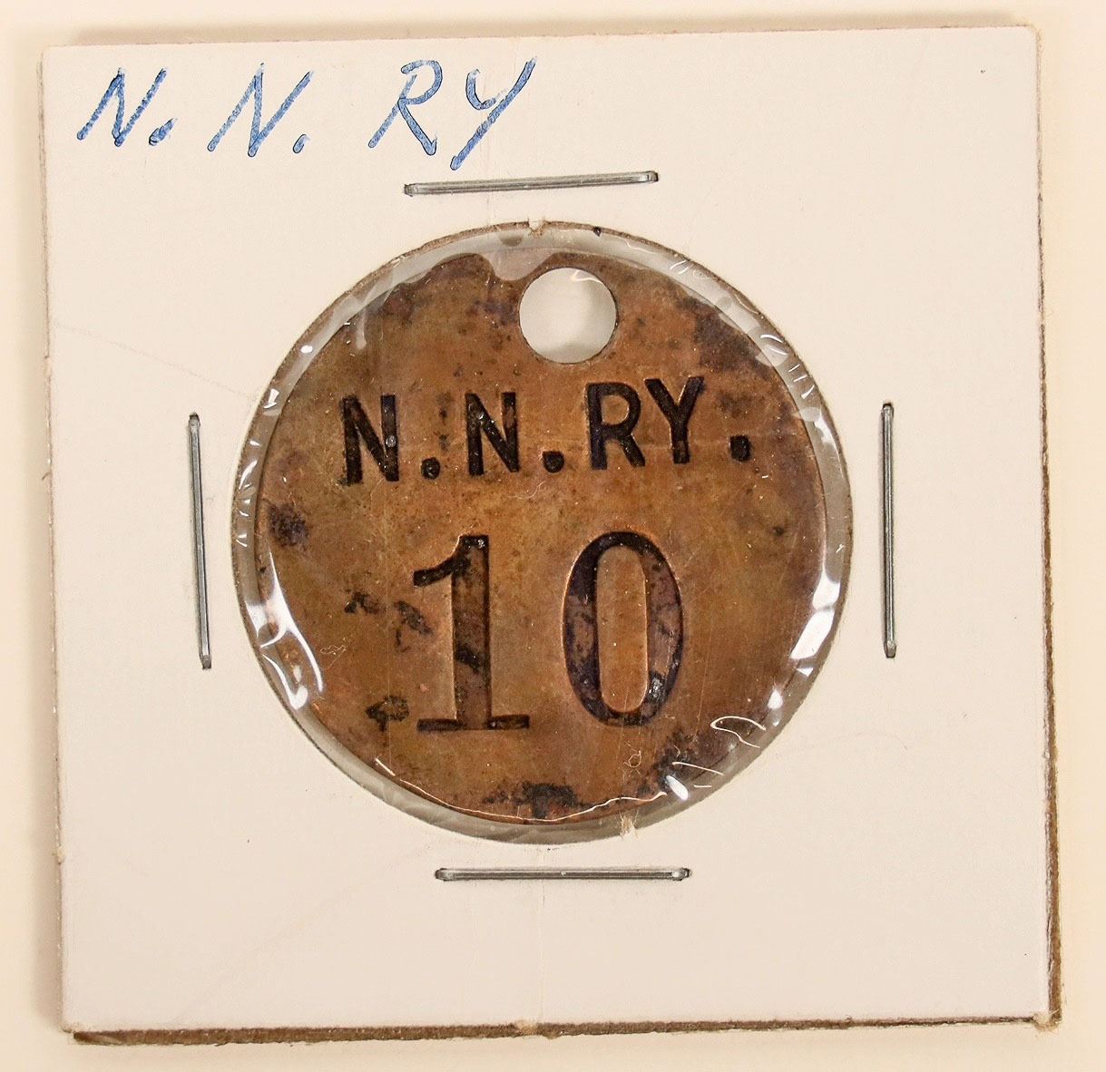 EXTRA RARE luggage tag from the Northern Nevada Railway. It's stamped N.N. RY 10. It measures about 1" and is in nice condition. Please see photos for more details.