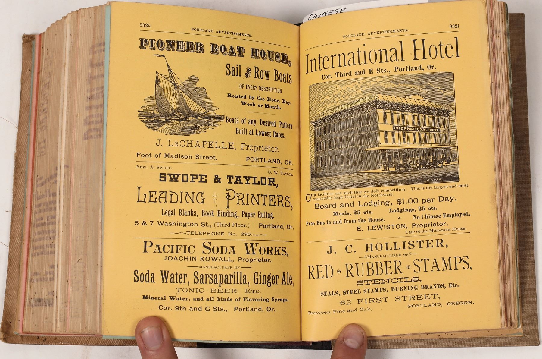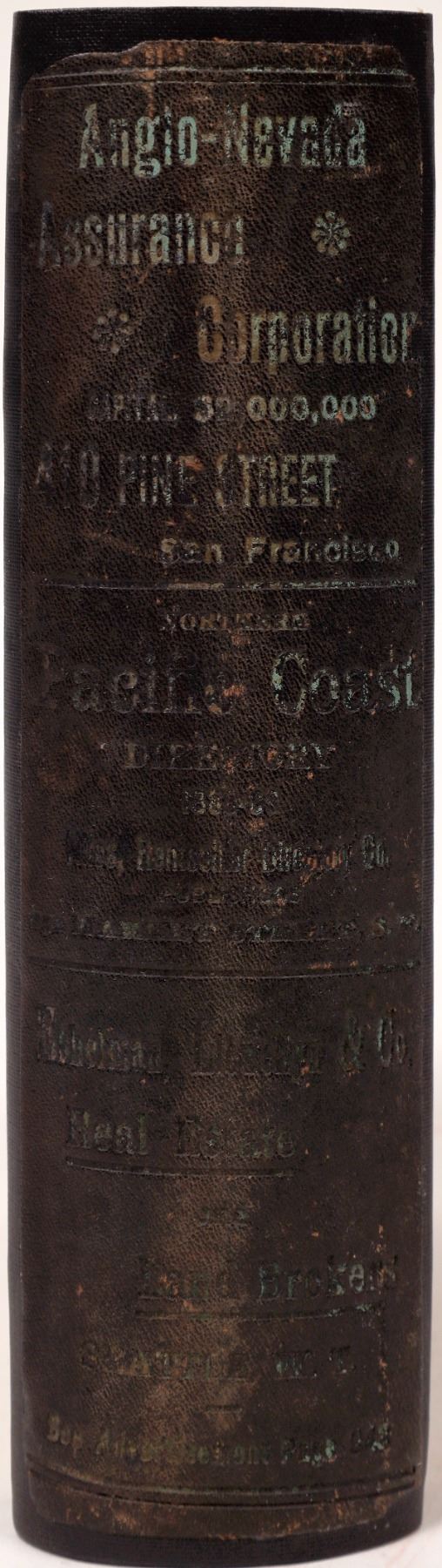 Northern Pacific Coast Directory printed in May 1888 by Niles-Rentschler Directory Co. Publishers in San Francisco, California. Extremely rare directory that contains information for towns along the Northern Pacific Coast in the United States and Canada. San Francisco, Oakland, Alameda, Berkeley, Albany, Albina, Astoria, Ashland, Central Point, Corvallis, East Portland, Eugene City, Hillsboro, Independence, Jacksonville, Lebanon, Medford, McMinnville, Newport, Old Tacoma, Portland, Salem, Seattle, Vancouver, and Yaquina. 1888-1889. Good condition. 7 x 5 inches.