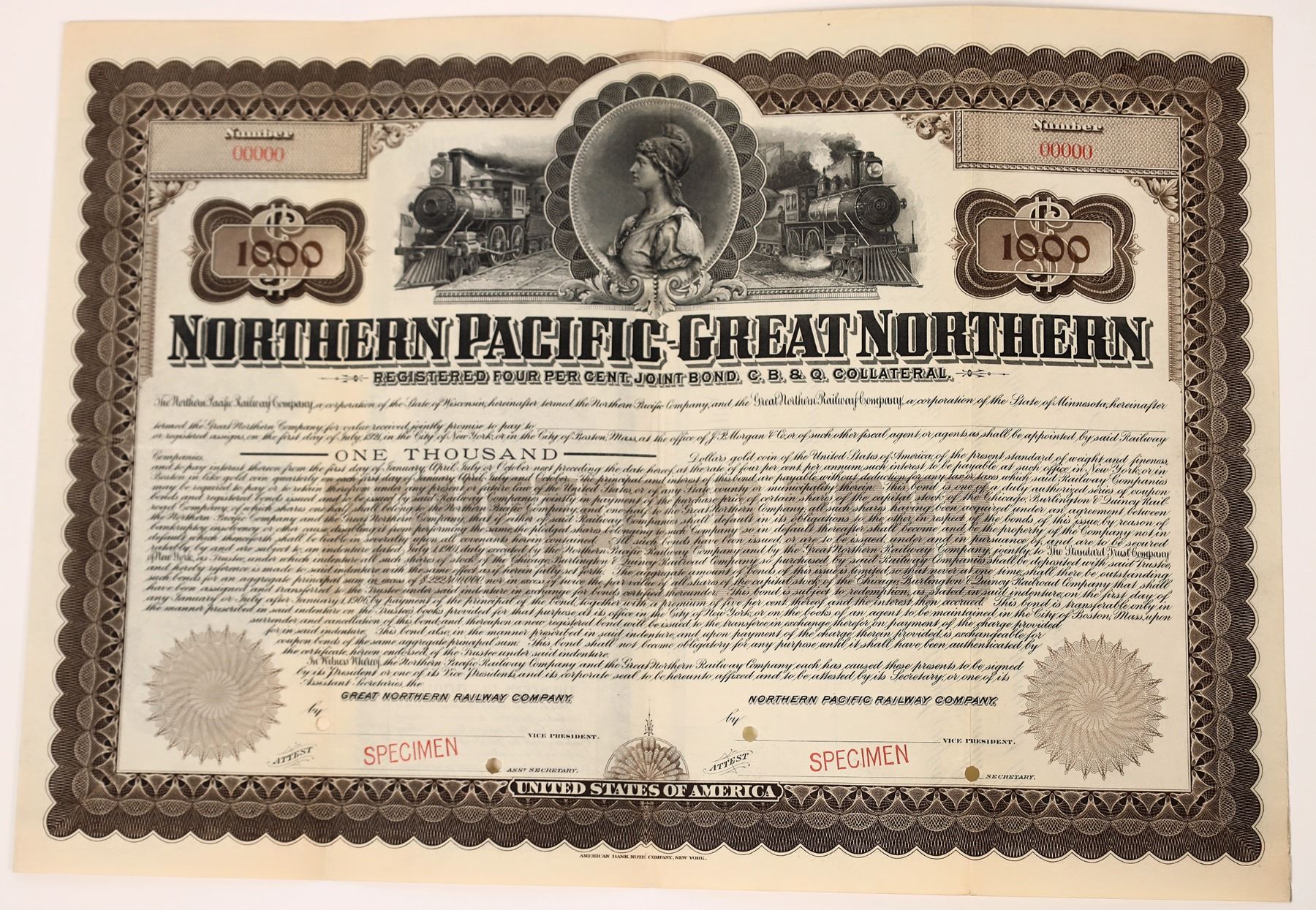 $1,000 four percent joint bond with CB&Q (Chicago, Burlington & Quincy) Collateral. Stamped Specimen across signature lines. Also punch cancelled. Brown border, black print, and vignette with locomotives on either side of a portrait of an allegorical woman. Printed by ABN. Folds. 9.5 x 19" (with stub).