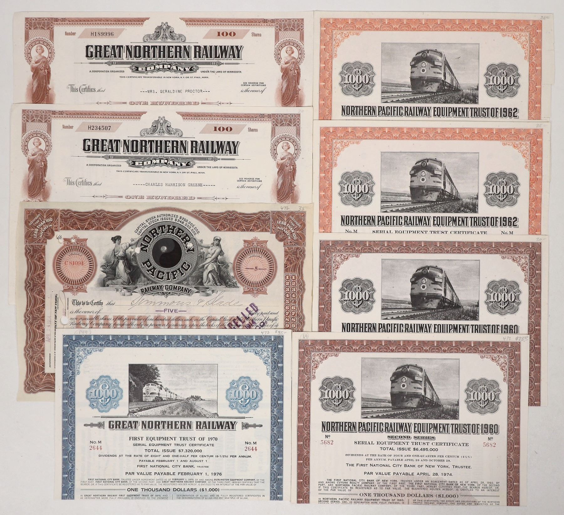 Bonds-1970 blue, 2x 1960 brown, 2x 1962 orange Northern Pacific RW. Stocks-1966 and 1968 Great Northern RW, 1914 Northern Pacific RW.
