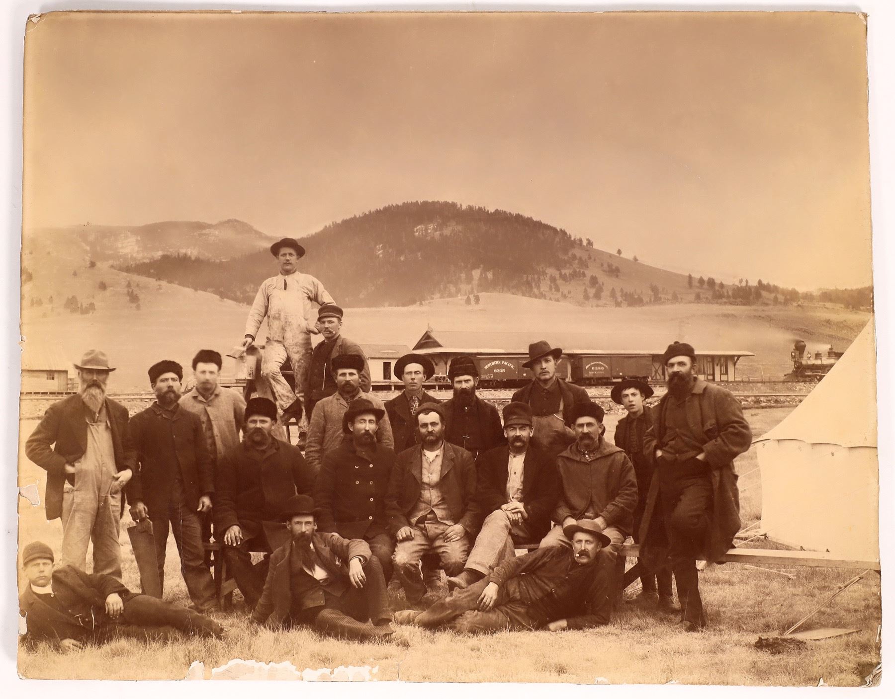 This location is not known to us. 19 men posing in front. Two Northern Pacific box cars are in the background. A steam engine is just clearing the tent on the right clearly burning wood and making steam. Some have a distinctive Eastern European look. Mounted photo on hard board. Photo measures 11.5 x 14.5" Condition Issues around edges. Please see photo.