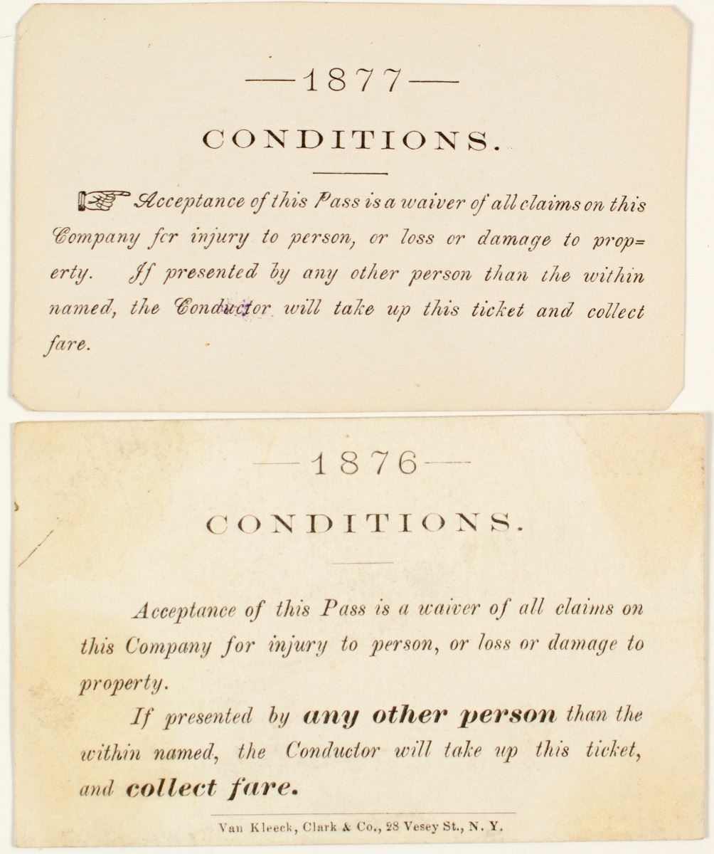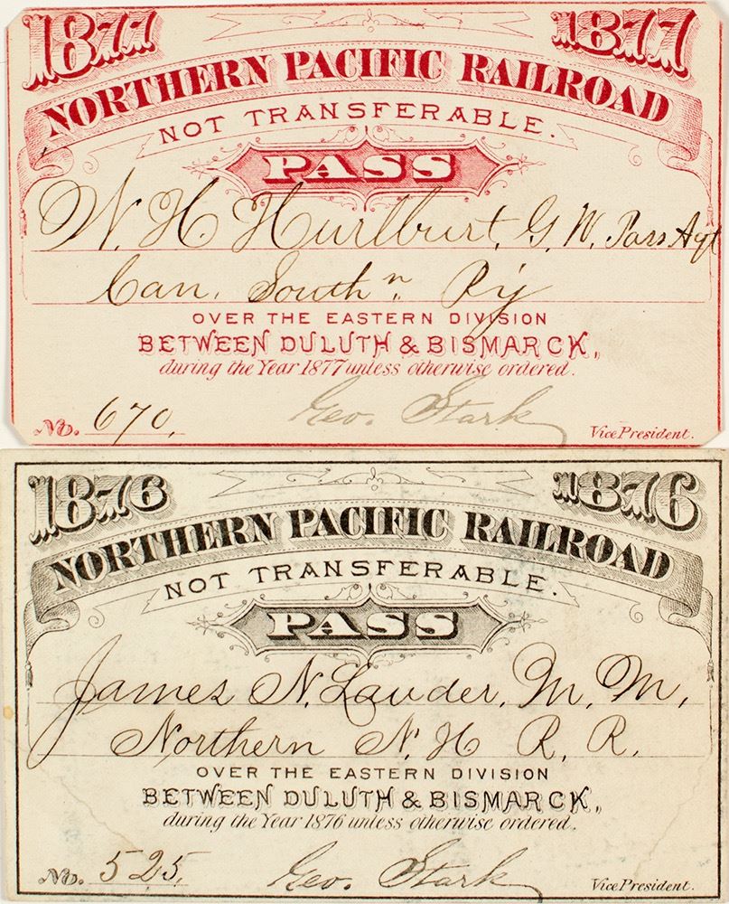 Lot of two early passes. 1) 1876 pass issued to James N. Lander, Northern N.H. Railroad. Signed by Geo. Stark as vice-president. Printed by Van Kleeck, Clark & Co., NY. Bent corners and some soiling. 2) 1877 pass issued W.H. Hurlburt, Canada Southern Railway. Also signed by Stark. Some soiling/toning. (Prag Collection) City: State: Date: Inventory# 41073