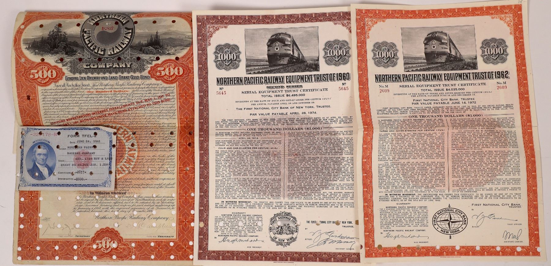 Lot of 3 different. Included: $500 bond issued in 1896, heavily punch cancelled, beautiful scenic vignettes; Northern Pacific Railway Equipment Trust of 1960, $1,000 bond, punch cancelled, train vignette; and Northern Pacific Railway Equipment Trust of 1962, $1,000 bond, punch cancelled, train vignette.