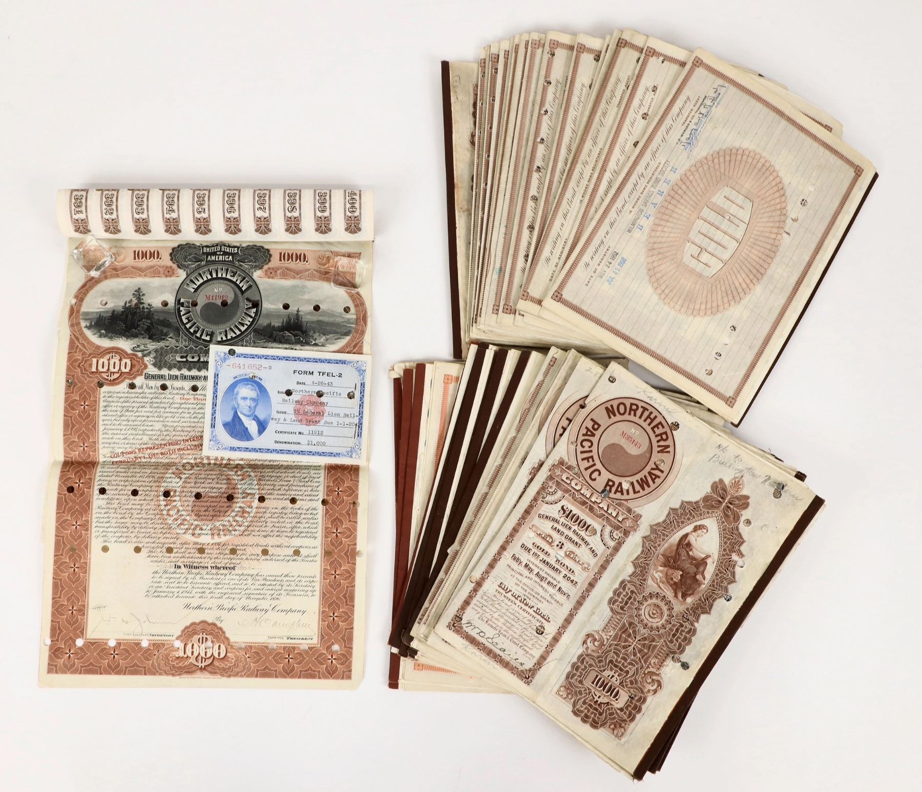 over 50+. I/C. Issued 1896. VG or better. Northern Pacific Railway, $1000, 3% gold bearer bonds. Two varieties. American BNC printer.