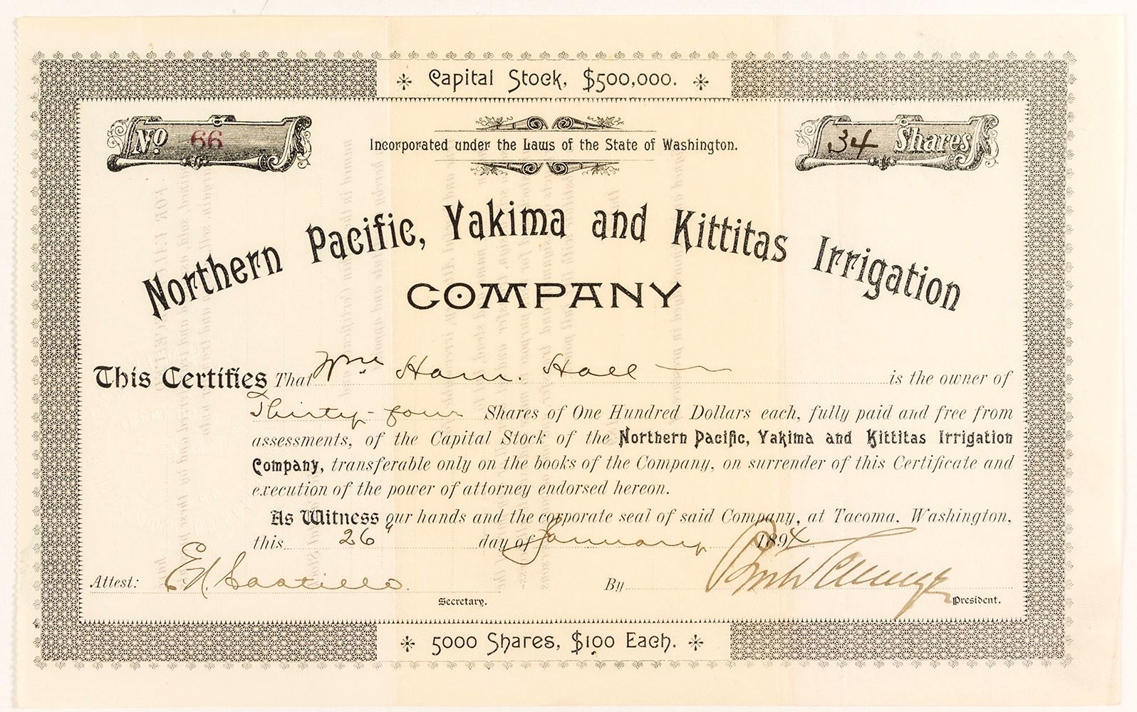 Rare certificate I/U 1894, #66, 34 shares. 6" x 9.75". Owned by Northern Pacific Railroad. They constructed the 60 mile long Sunnyside Canal which brought water from the Yakima River near the town of Parker, southeast to the town of Prosser. The canal was sold in 1900 to the Washington Irrigation Company, then later sold to the United States Reclamation Service in 1905. Date: Location: Yakima County, Washington HWAC # 54340