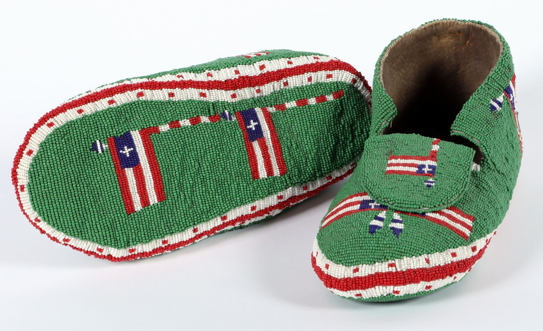 Fully beaded with green, red, white & blue colors. The bottom of the moccasins are fully beaded, hence, one is to be buried in them, they will never be walked on where the spirit goes on a journey (funeral Mocs.) Men's size, small. Red, white & blue flags on tongue, bottom & sides. Spectacular craftsmanship in applique technique. . 5" x 10.25". Background is in Cheyenne green.