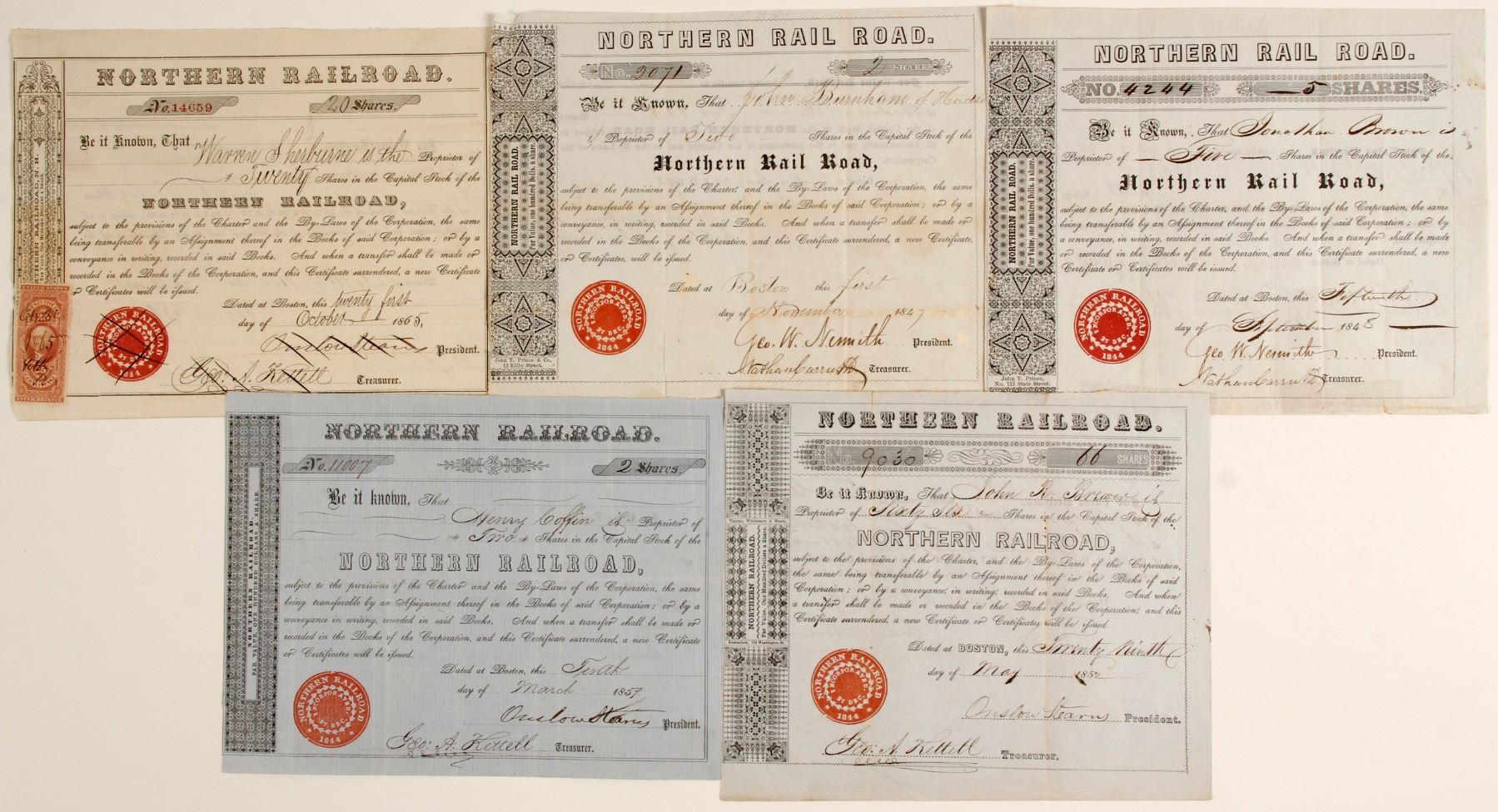 Northern Railroad(Mass); 5 total, 5 varieties. Two 1848-1865, 1 cancelled; signed by Nesmith as president; four uncancelled; signed by Nesmith as president. Some not listed on Cox. All issued in Boston, Massachusetts. All in good condition. Prag Collection. City: State: Date: HWAC# 79607