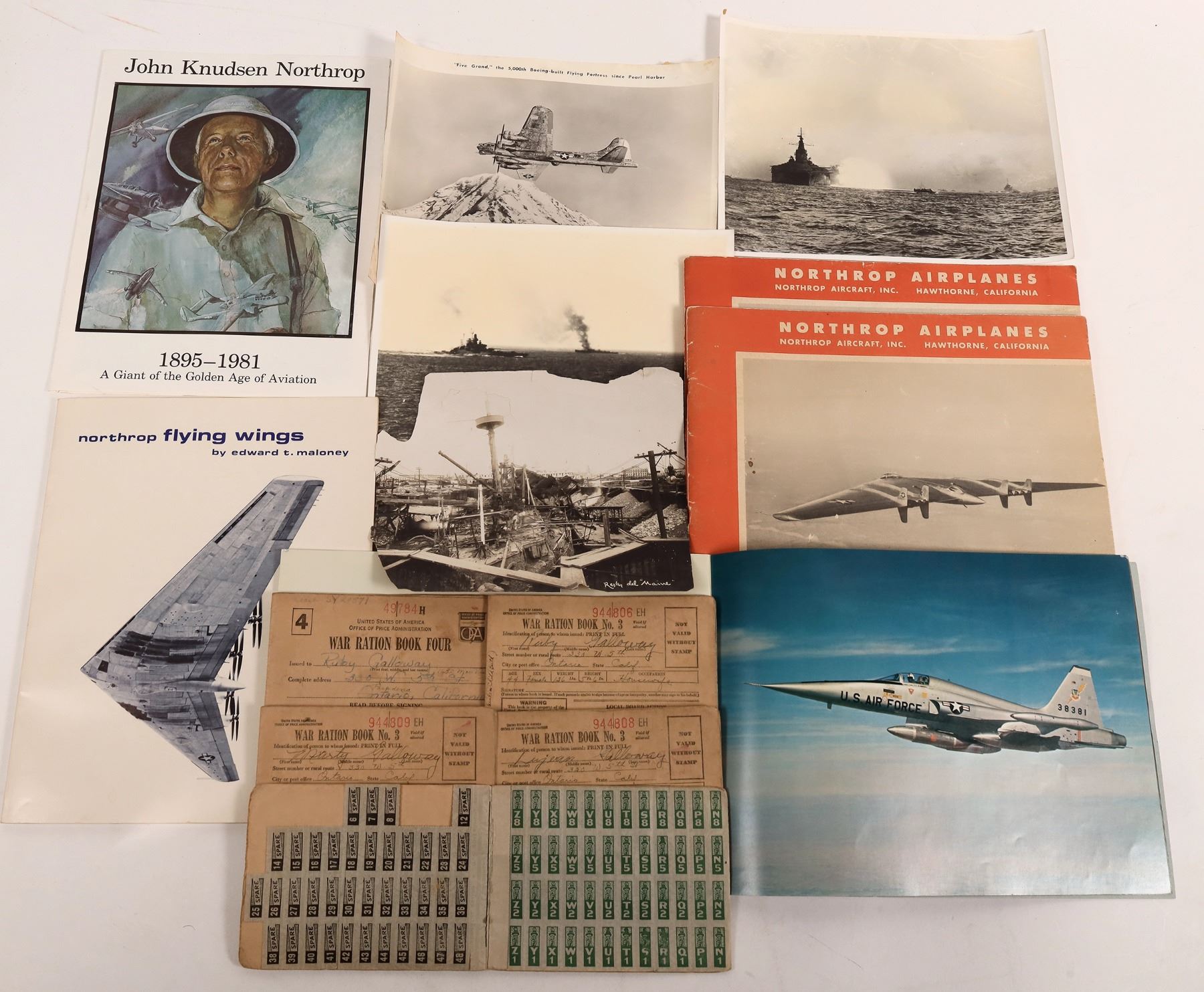 "John Knudsen Northrop (November 10, 1895 - February 18, 1981) was an American aircraft industrialist and designer who founded the Northrop Corporation in 1939. His career began in 1916 as a draftsman for Loughead Aircraft Manufacturing Company (founded 1912). He joined the Douglas Aircraft Company in 1923, where in time he became a project engineer. In 1927 he joined the Lockheed Corporation, where he was a chief engineer on the Lockheed Vega transport. He left in 1929 to found Avion Corporation, which he sold in 1930. Two years later, he founded the Northrop Corporation. This firm became a subsidiary of Douglas Aircraft in 1939, so he co-founded a second company named Northrop." from Wikipedia. Northrop Flying Wings by Maloney, 55pp with technical drawings. 2x Northrop Airlines product booklets, 1927-47. 1971 Northrop, Flying Through the Years-light water damage. Misc. military ephemera-6 WW2 ration books. 8x10" b/w photos-Five Grand, the 5000th built B-17, 2 WW2 battleships, partial Maine with damage.