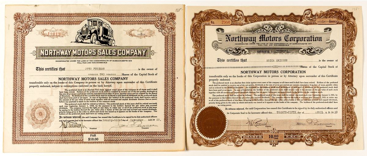Two different certificates for this auto. company incorporated in Massachusetts. 1) Northway Motors Corporation. No. 2996, issued for one share to Erica Ericson on April 25, 1919. Brown border and seal. Not cancelled. Signed by president and treasurer. 2) Northway Motor Sales Company. No. 10019. Issued for two shares to Otto Pushman on Dec. 23, 1920. Maroon border and automobile vignette. Signed by president and treasurer. Not cancelled. (Prag Collection) City: State: Date: 1919 & 1920 hwac# 31336