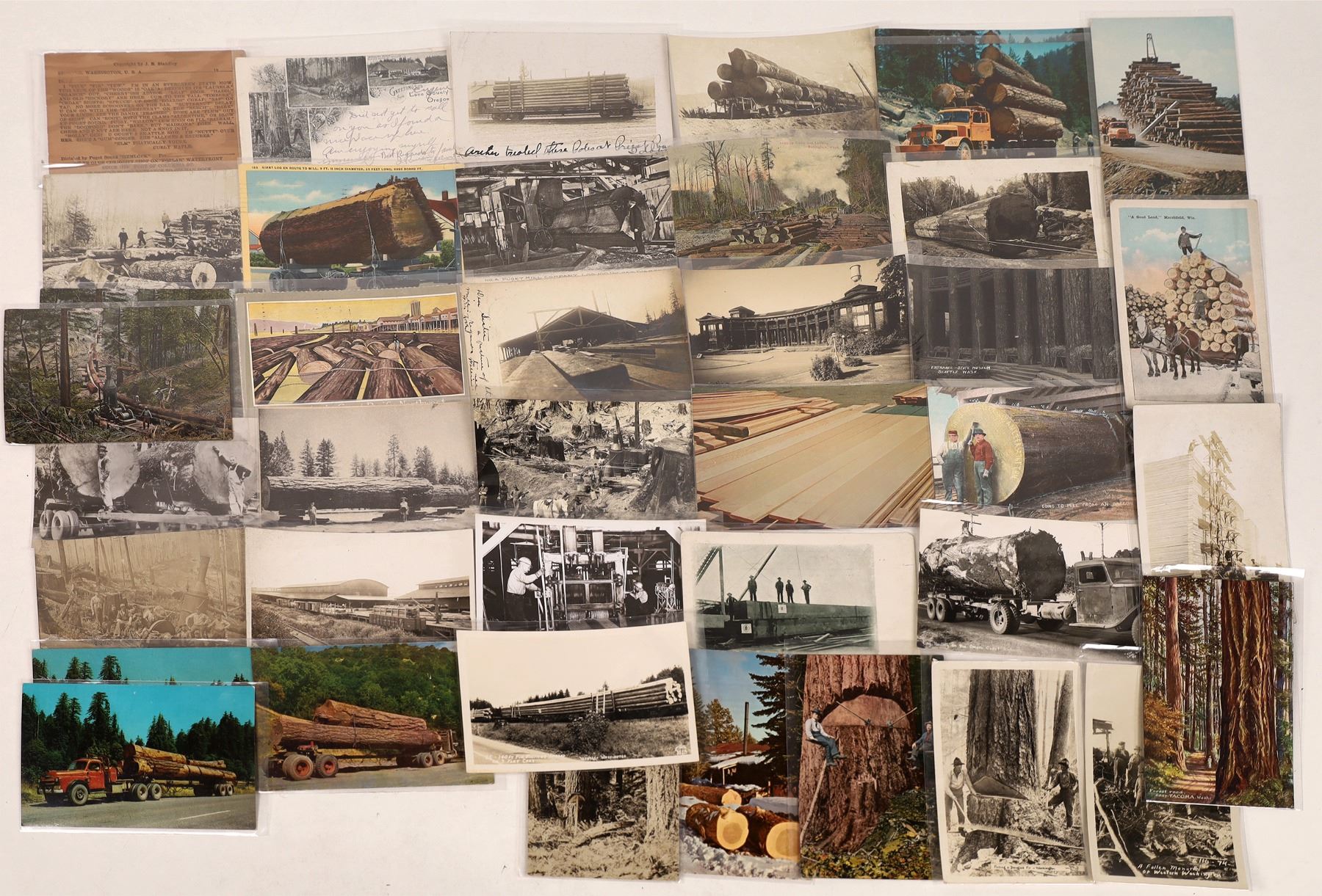 Lot of 40. Fourteen postmarked w/stamps (1,2,4 cents). Ground views of mills, equipment, hauling logs by trucks, horse teams and trains. Mix of RPC’s and color. One Wash. State Fir wooden post card no writing. State Museum of Wash State University. Protective sleeves