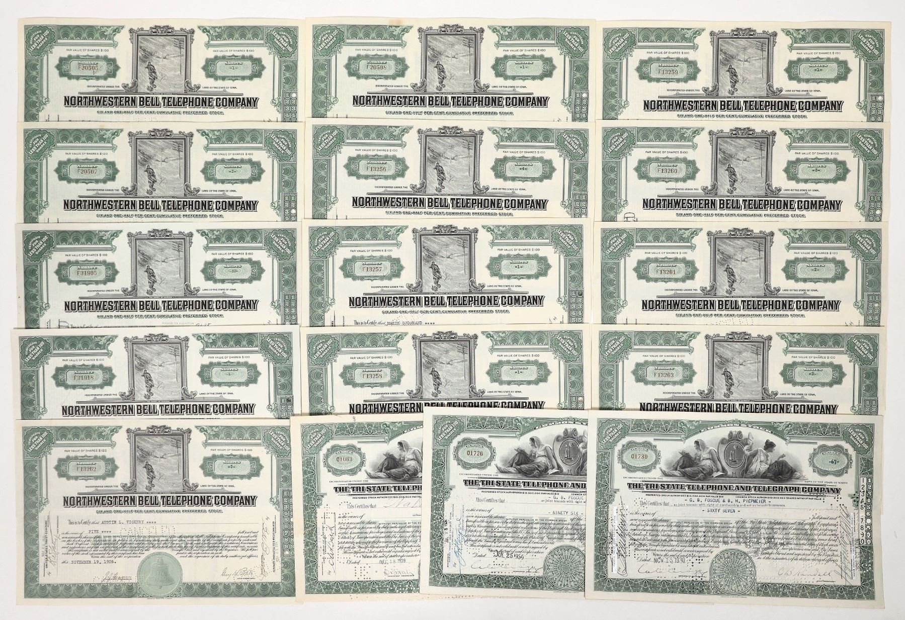 A group of 16 stock certificates from the Northwestern Bell Telephone Company, dated 1926 to 1937. Each certificate is signed by the assistant treasurer and vice president of the company; each also bears an embossed company seal. The certificates each have a beautiful vignette of a snowstorm over telephone lines with a telephone worker snowshoeing through the storm. All certificates are cancelled using hole-punch or stamp cancellations. All are in good condition.