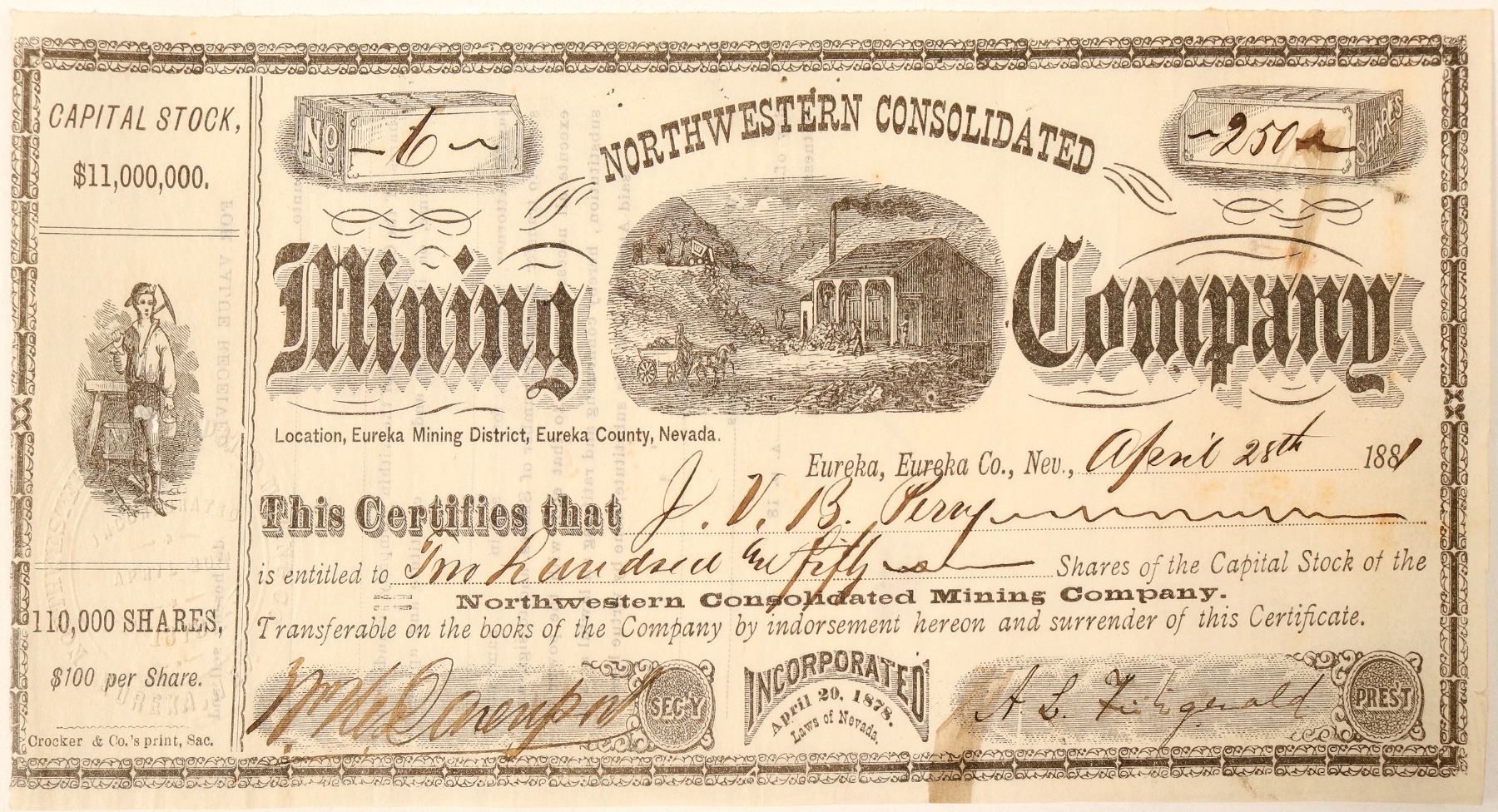 Location: Eureka Mining District, Eureka County, Nevada (printed under logo). Inc. April 20, 1878. Dateline Eureka, April 28th, 1881. Low No. 6, issued for to 250 shares to J.V.B. Perry. Signed by A.L. Fitzgerald (president) and Campbell (secretary). Not cancelled. Folds, pinhole, ink stains. This certificate, printed by Crocker & Co., is reminiscent of the 1860s Nevada stock designs. 4.25 x 9.25" Vignette of mine and mill facility (top center) and prospector (left border). J.V.B. Perry was a U.S. Marshall and then constable in Virginia City, Nevada Territory in 1863/64. He is also later listed as a saloon owner in Eureka, Nevada in the 1884 Colorado, New Mexico, Utah, Nevada, Wyoming and Arizona Gazetteer and Business Directory. According to E&MJ, Vol. 34, the company had patented claims on the Western & Winchester Lode. () Ken Prag Collection