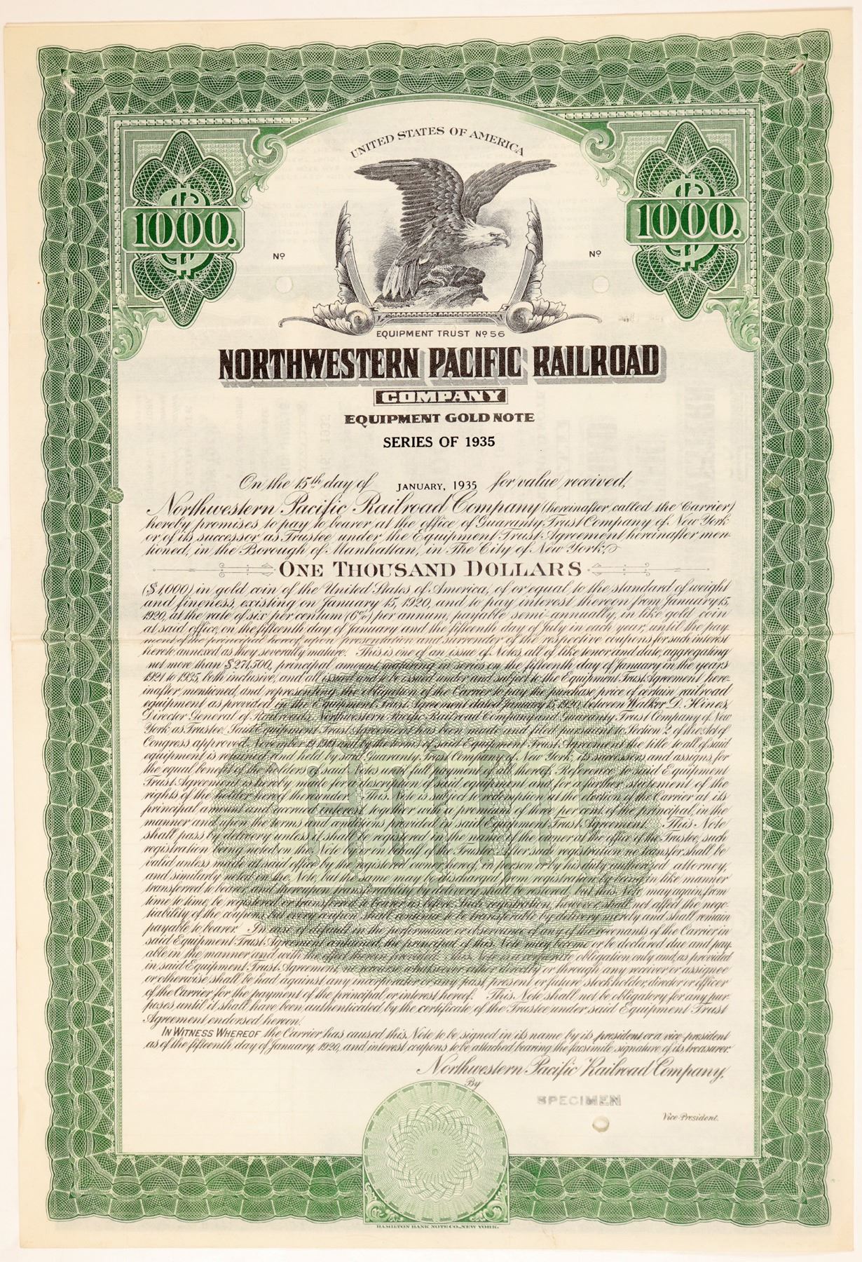 Specimen, U/C, $1000 6% 15 yr. Equipment Gold bearer note series 1935. Dated Jan 15, 1920. GREEN, vignette top eagle wings spread, looking r-l. "GOLD" in green underprint over burst, coupons #6-30 attached. Hamilton Bank Note Co. printer. AU. Ken Prag Collection