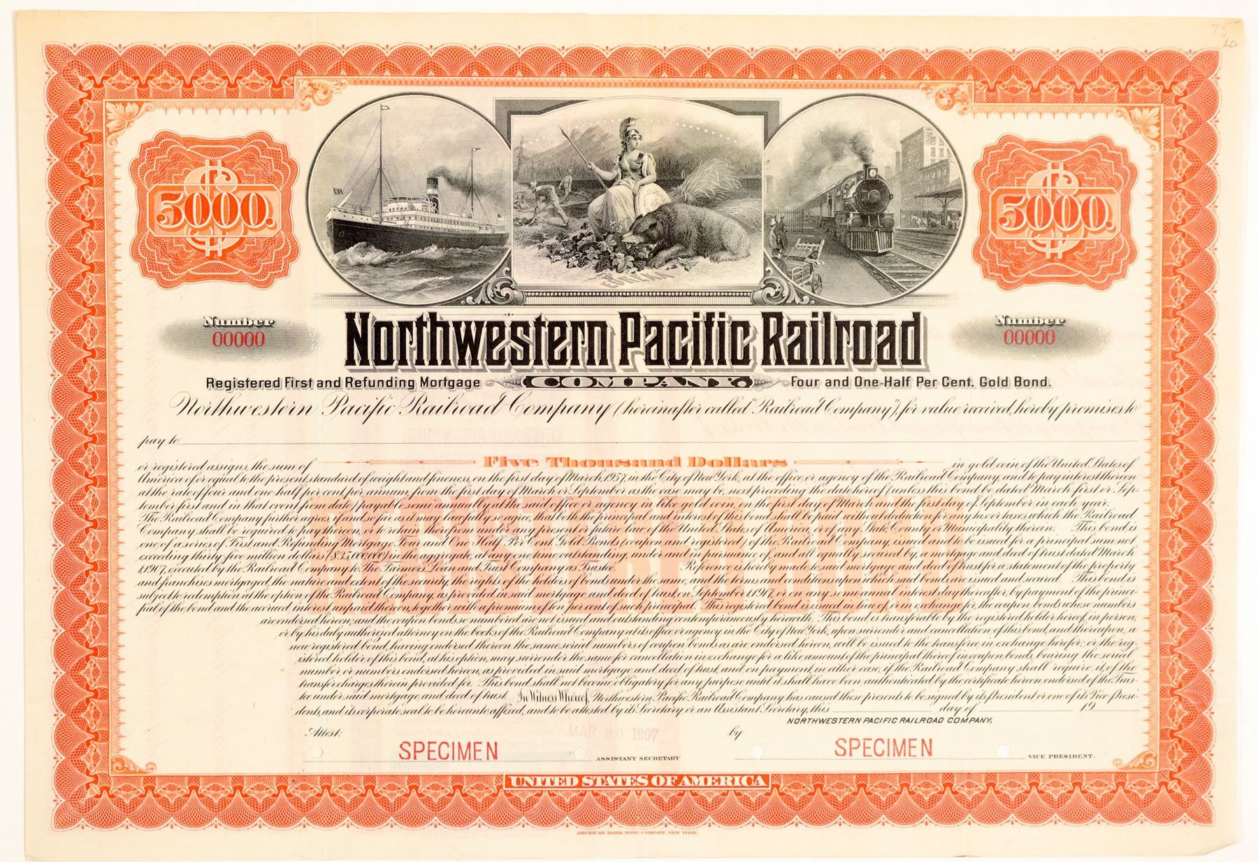 Specimen #00000, U/C, $5000 4 1/2 % Registered First and Refunding Mortgage Gold bearer bond due 1937. ORANGE, triple vignette top: steamship left-state seal center-loco l-r @ station right. "REGISTERED BOND" in orange underprint.receipt attached, tri-fold light crease, no pin holes. American Bank Note Co. printer. Ken Prag Collection