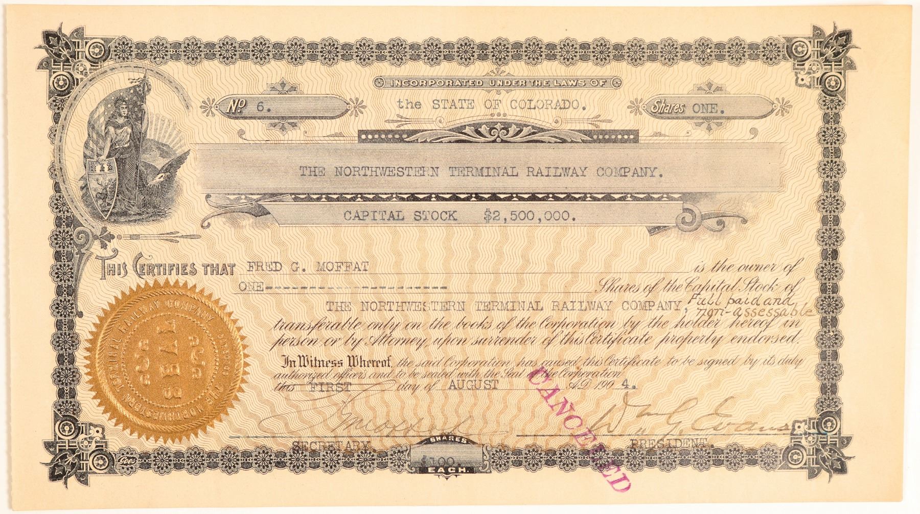 Stock Certificate from the Northwestern Terminal Railway Co. Incorporated in Colorado. Certificate number 6 issued on August 1st, 1904, at Denver to Fred G. Moffat. Signed by president William Evans and F. Moffat. Size 10.5 by 5.5 inches. In nice condition. Canceled. Allegorical vignette of clothed woman holding a flag. Typed title, issue and share count. Printed seal. Signed by Wm. Evans & Fred G. Moffat. Moffat incorporated the Northwestern Terminal Railway, a subsidiary company of the Moffat Road, in 1904. A single-track, standard-gauge, steam railroad running from 15th Street, Denver, to Utah Junction, 3.180 miles. This independent company was charged with building all of the terminals of the railroad. The company was also responsible for locating and purchasing a right-of-way and Denver property for a main terminal. They purchased the right-of-way leading to where they built the Moffat Station. The station was completed in 1906.