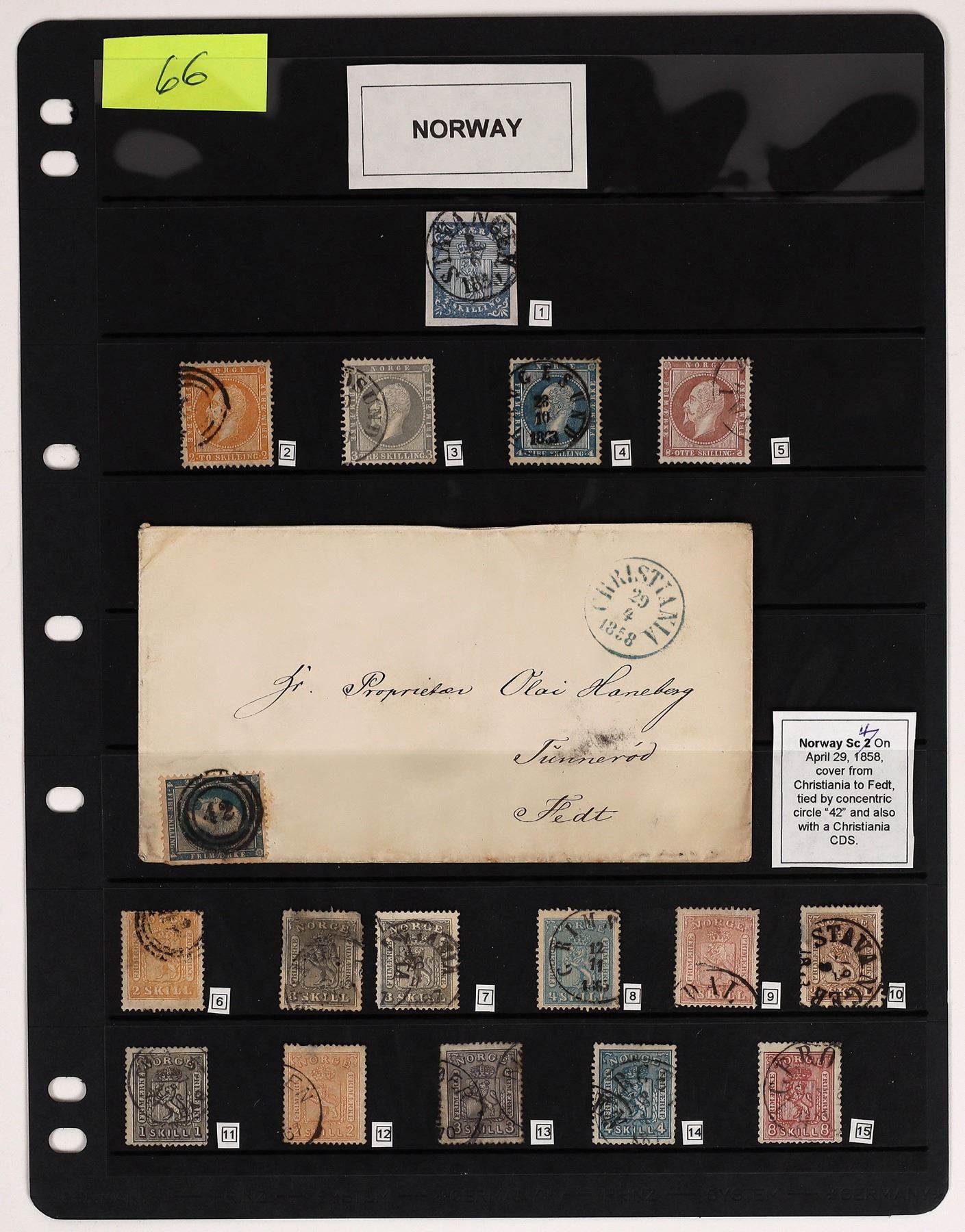 Norway. 1855-1907 issues complete (Scott #1-66), 1855-7 all nice copies, noted 1863 2s & 3s (x2), 1884 12 ore green, etc., owner's 2005 Scott $3,206, please see scans, also 1858 cover with 1856 4s.