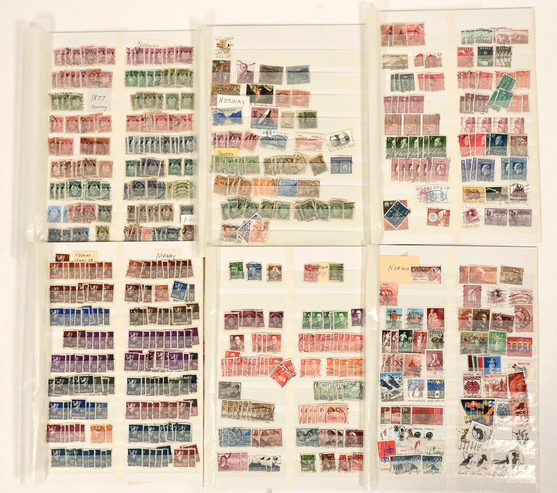 About 900 Norway stamps, 1880's to modern, mostly used with dupes on modern. About 250 Sweden stamps, 1879-newer, mostly used with some later dupes.
