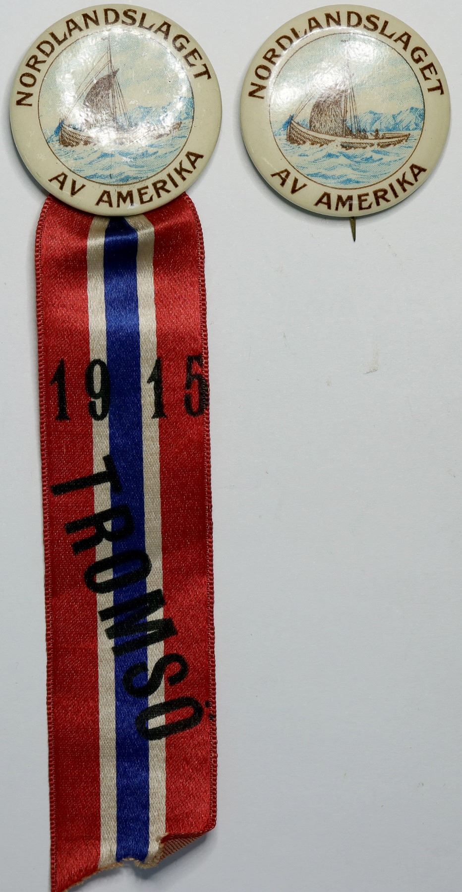 Two pin backs from descendants who emigrated from specific localities in Norway to North America. Each has picture of longship in color. One has a ribbon (red/white/blue) w/1915 Tromso printed on it.