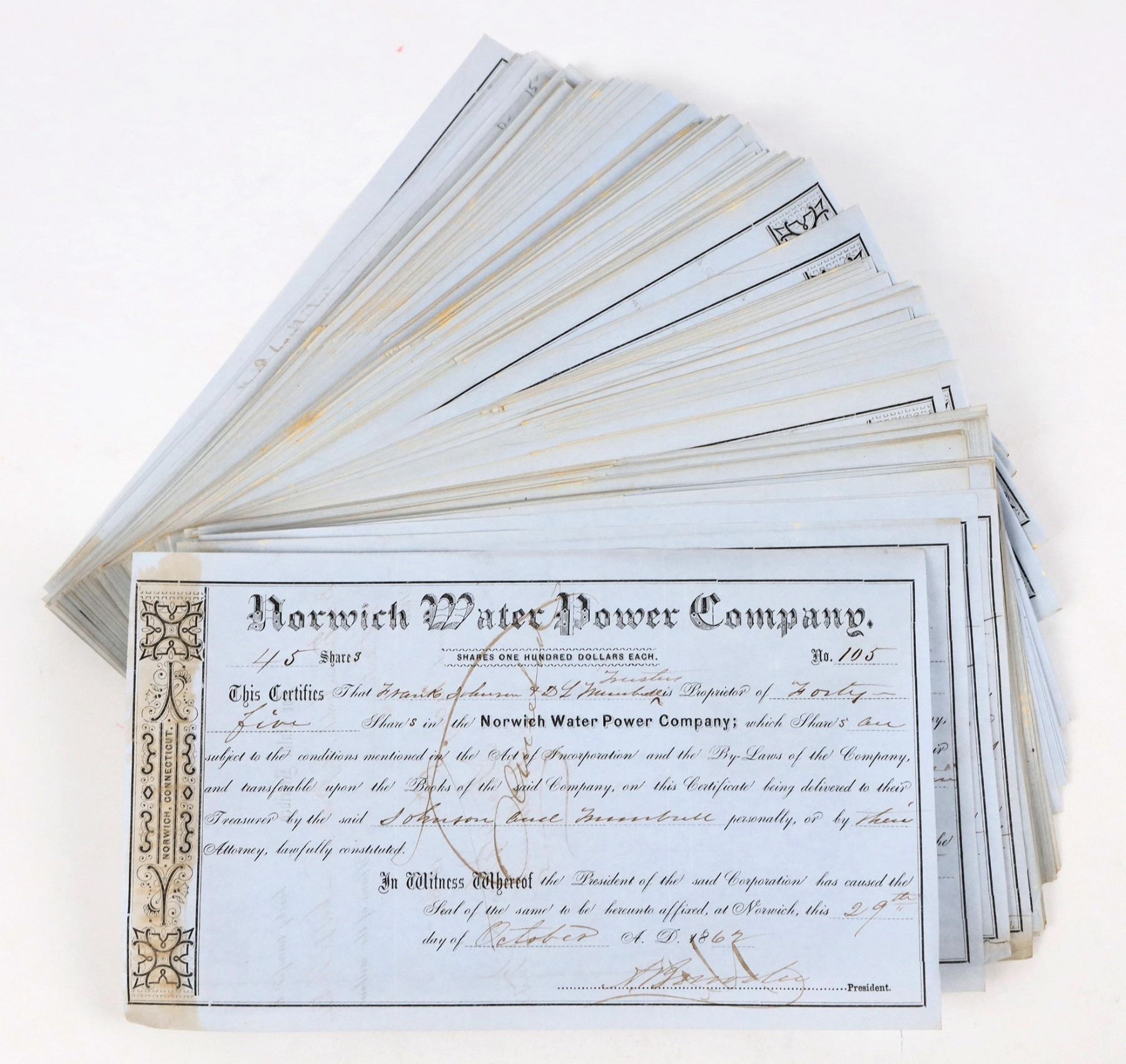 Norwich Water Power Company Stocks, about 200. About 5 issued 1862-65. The remainder are unissued.