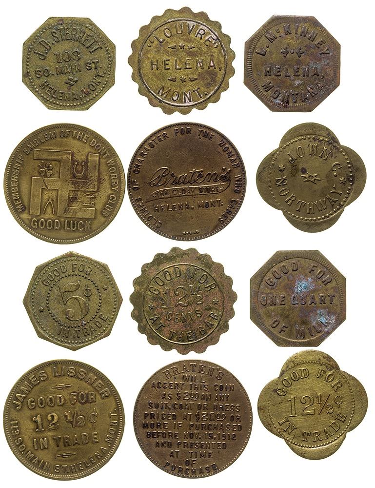 6 Tokens in total that are either scalloped, octagonal, or over-sized. R-6 Louvre / Helena, / Mont. // GF / 12 1/2 / Cents/ At The Bar. Scalloped (19), Brass, 29mm. R-6 Clothes of Character For The Woman Who Cares / Braten's / The Cloak Store / Helena, Mont. // Braten's / Will Accept This Coin As $2.00 On Any Suit, Coat, Or Dress Priced At $20.00 Or More If Purchased Before Nov. 15, 1912 and Presented At Time Of Purchase. Round, Brass, 32mm. R-6 James Lissner / GF / 12 1/2c / IT / 113 So. Main st. Helena, Mont. // Membership Emblem of The Don't Worry Club / Good Luck. (Swastika Pictorial) Round, Brass, 33mm. R-5 John C. / Northway // GF / 12 1/2c / IT. Scalloped (4), Brass, 29mm. Others Include 2 R-5 Octagonals. City: Helena State: Montana, Date: Inventory# 39734