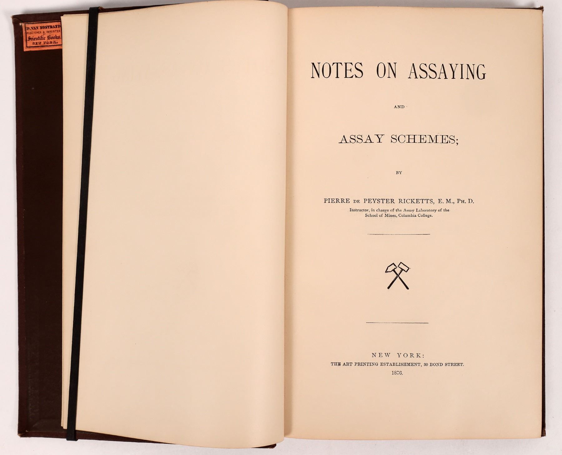 Notes on Assaying and Assay Schemes by Ricketts. Sold from D Van Nostrand, NY and J I Williams Worcester, Mass. 1876, 169pp plus index. Has foldouts with Zettnow's Scheme and another with equipment. Spine and corners have wear.