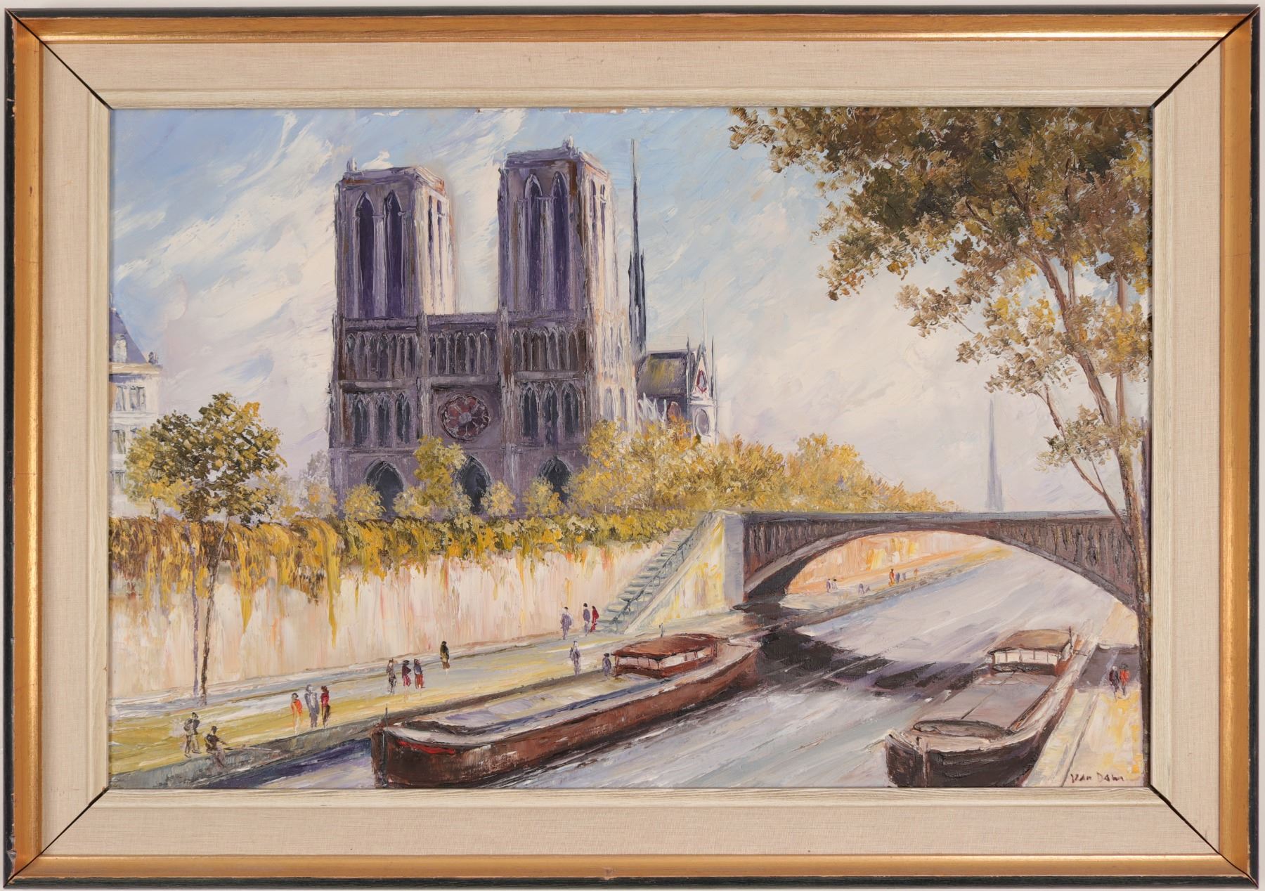 Painting of Notre Dame cathedral signed by "Van Dam". 20" x 30", framed 25" x 35".