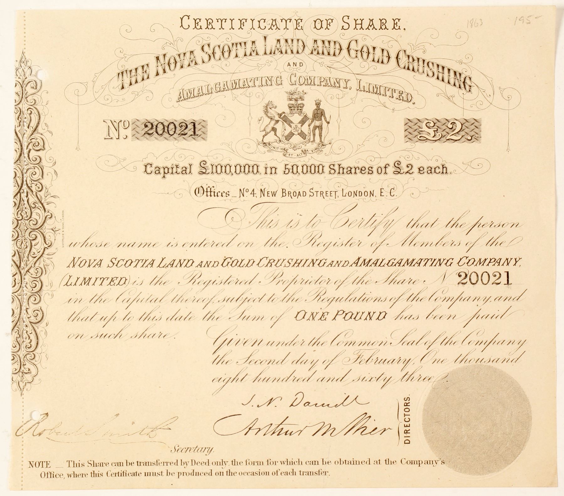 Early! Offices at No. 4, New Broad Street in London. No. 20021, issued for one share on Feb. 2nd, 1863. Signed by two directors (Arthur Weir and J.N. Daniell) and the secretary (Robert Smith). Printed on thin paper cut tight on the left. Punch cancelled. 7.5 x 8.5" According to Herapath's Railway Journal (Dec. 19th, 1863), the company had properties at Oldham and Sherbrooke, as well as crushing machinery at Wine Harbour. 112 ounces of gold had been processed at the former. (Prag Collection) State: Canada City: Nova Scotia Date:
