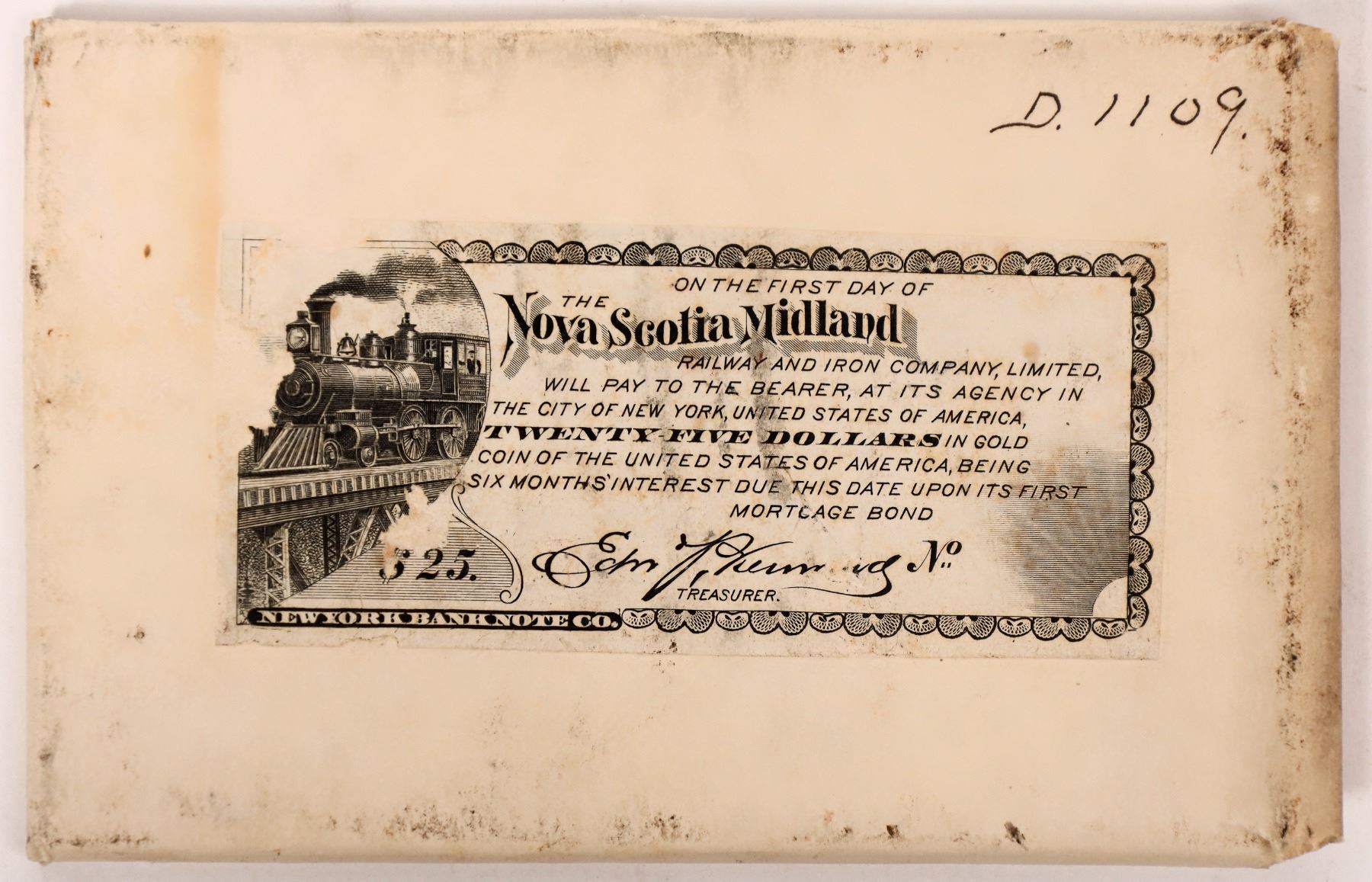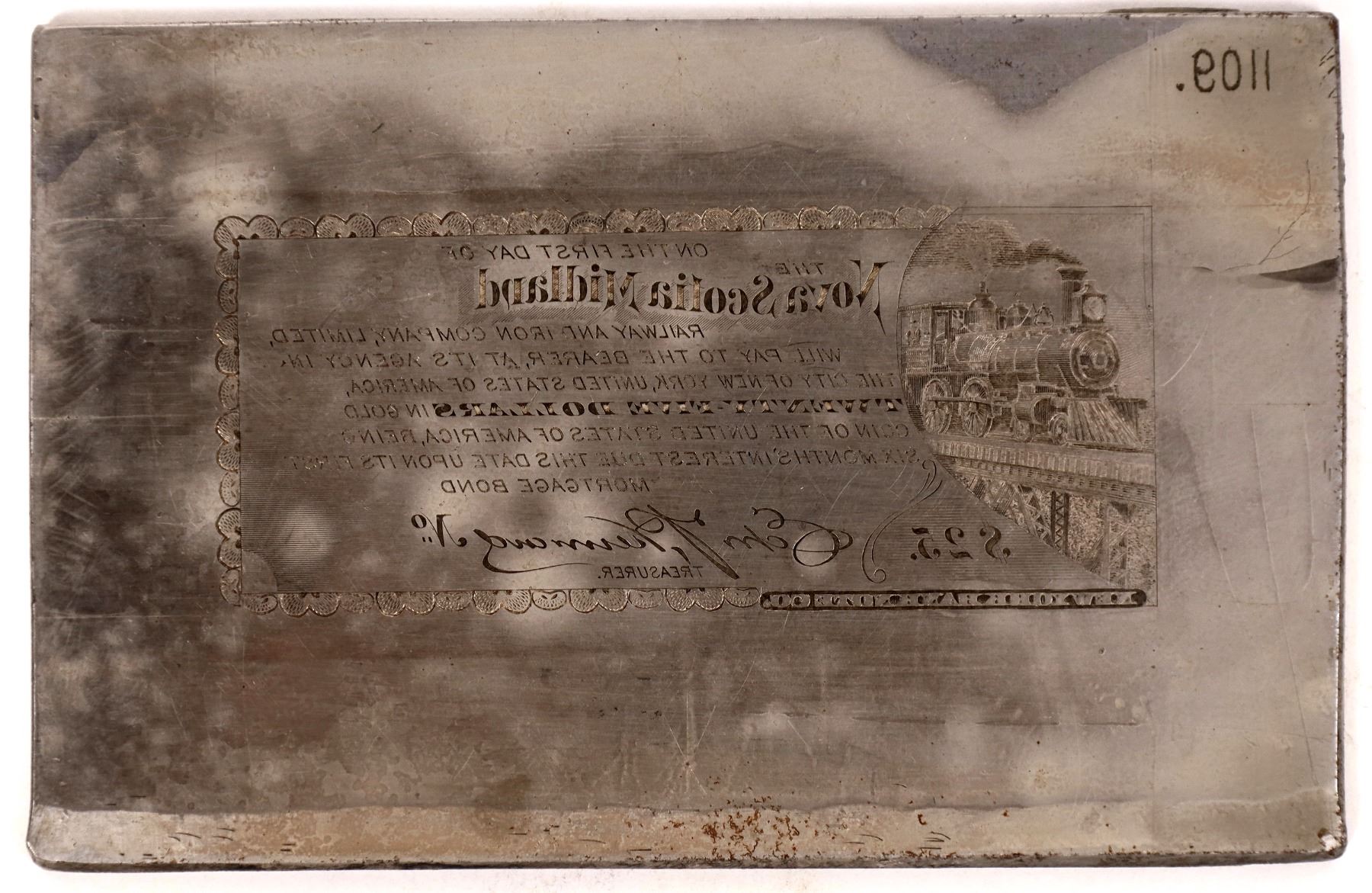 Steel printers plate for a bond coupon of the Nova Scotia Midland Railway & Iron Company. Comes with paper sleeve that has an example coupon attached! $25 in gold coin. Not dated. New York Bank Note Company. Signed by the treasurer. Great locomotive vignette! Identified in upper corner as 1109. Reverse shows signs of use. 2.75 x 4" Line completed in 1901; headquartered at Truro, Nova Scotia.