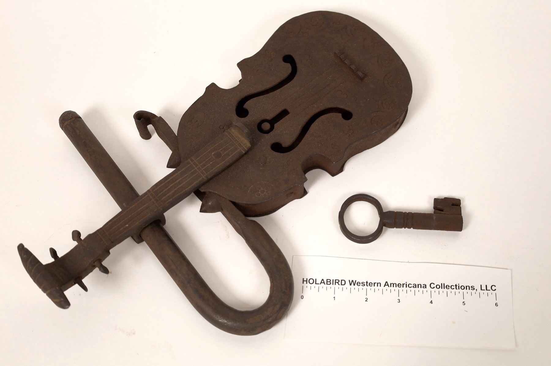 A very unique, to say the least, lock and key for a business in Austin, Nevada. The lock is in the shape of a violin and measures 14"x 5.5" and the locking bar measures about 10" and the key 4"x 2". This is an unusual piece that really shows the flamboyance of the store owner and his desire to draw in customers. Be the first one on your block to own this one of a kind item. Please see photos for more detail and condition.