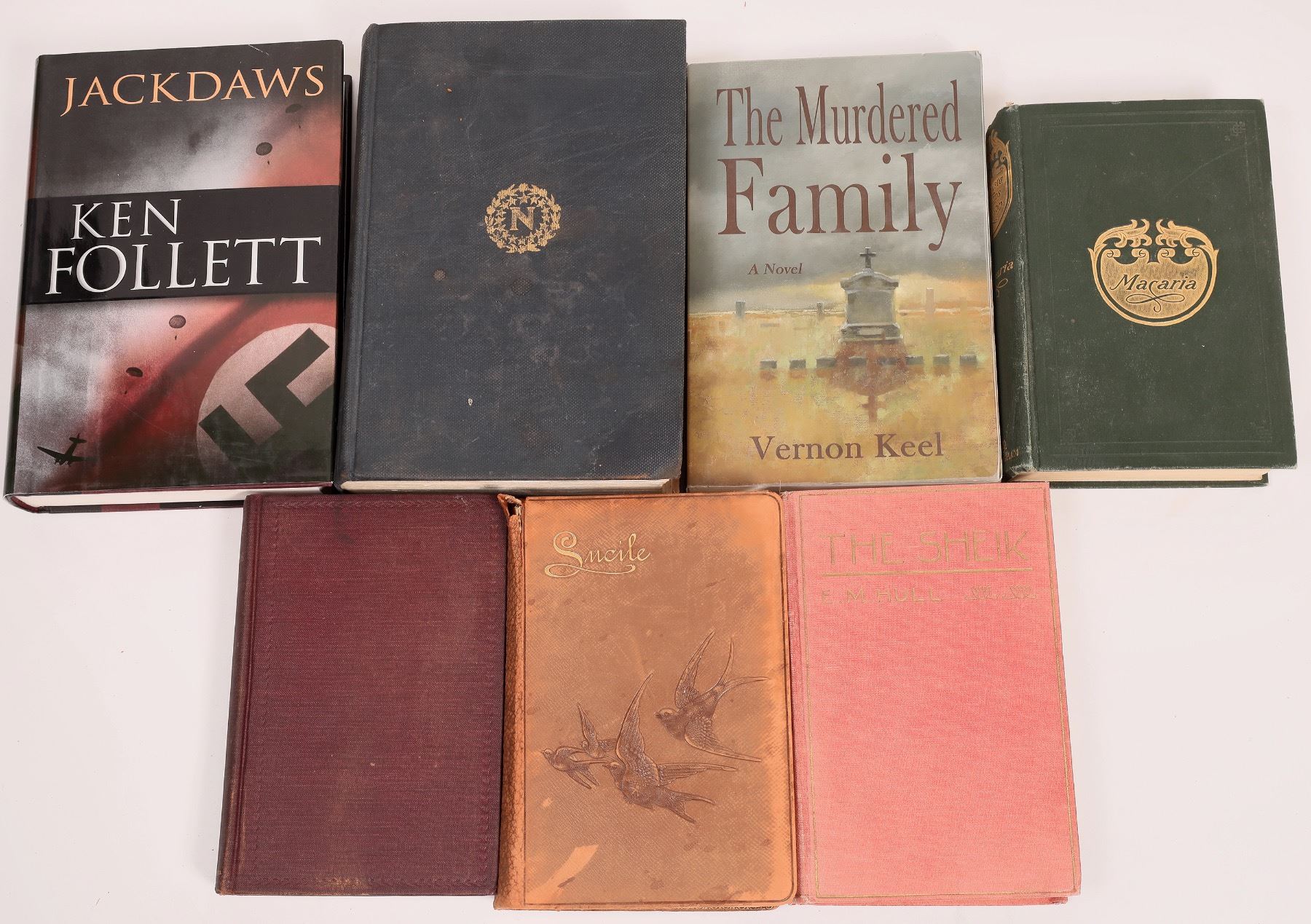 Jackdaws by Follett. Napoleon by Ludwig. Romance of Two Worlds by Corelli. Lucile by Meridith with bird embossed cover. The Sheik by Hull. The Murder of Family by Keel. Macaria by Wilson with attractive binding.
