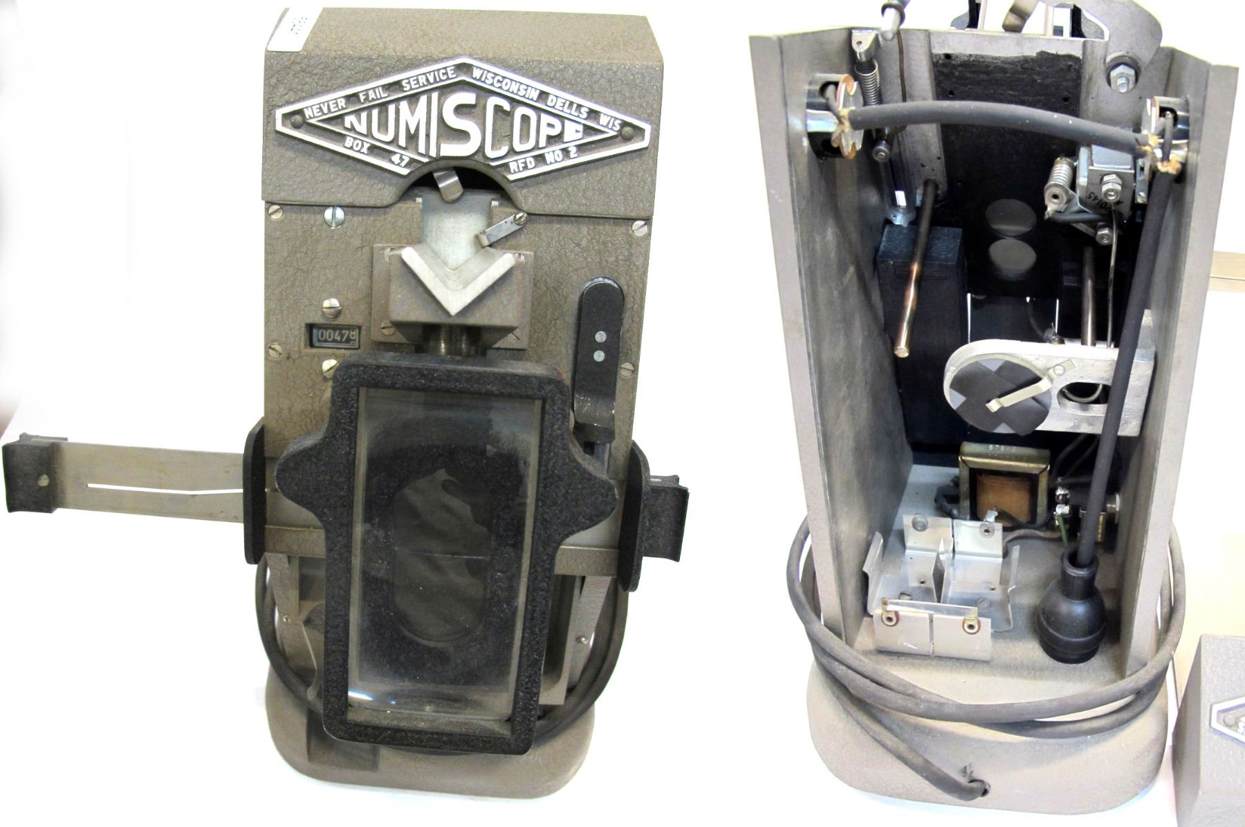 Numiscope Coin machine, apparently for counterfeit detection of US $5 gold coins by magnification. The machine does not fit a US quarter, at 24.3mm, and appears to only fit a US $5 at 21.6mm. A lens on the front allows the viewer to look at coins in detail. There may be other functions within the machine that can appraise density. Electronic. Can sort reject coins to one side, and legitimate coins to the other side. Rare. We have not had one of these before. Constructed of white metal, painted with crackled gray, manufacturer name embossed on top front panel. Excellent condition. Appears 1920's-30's.
