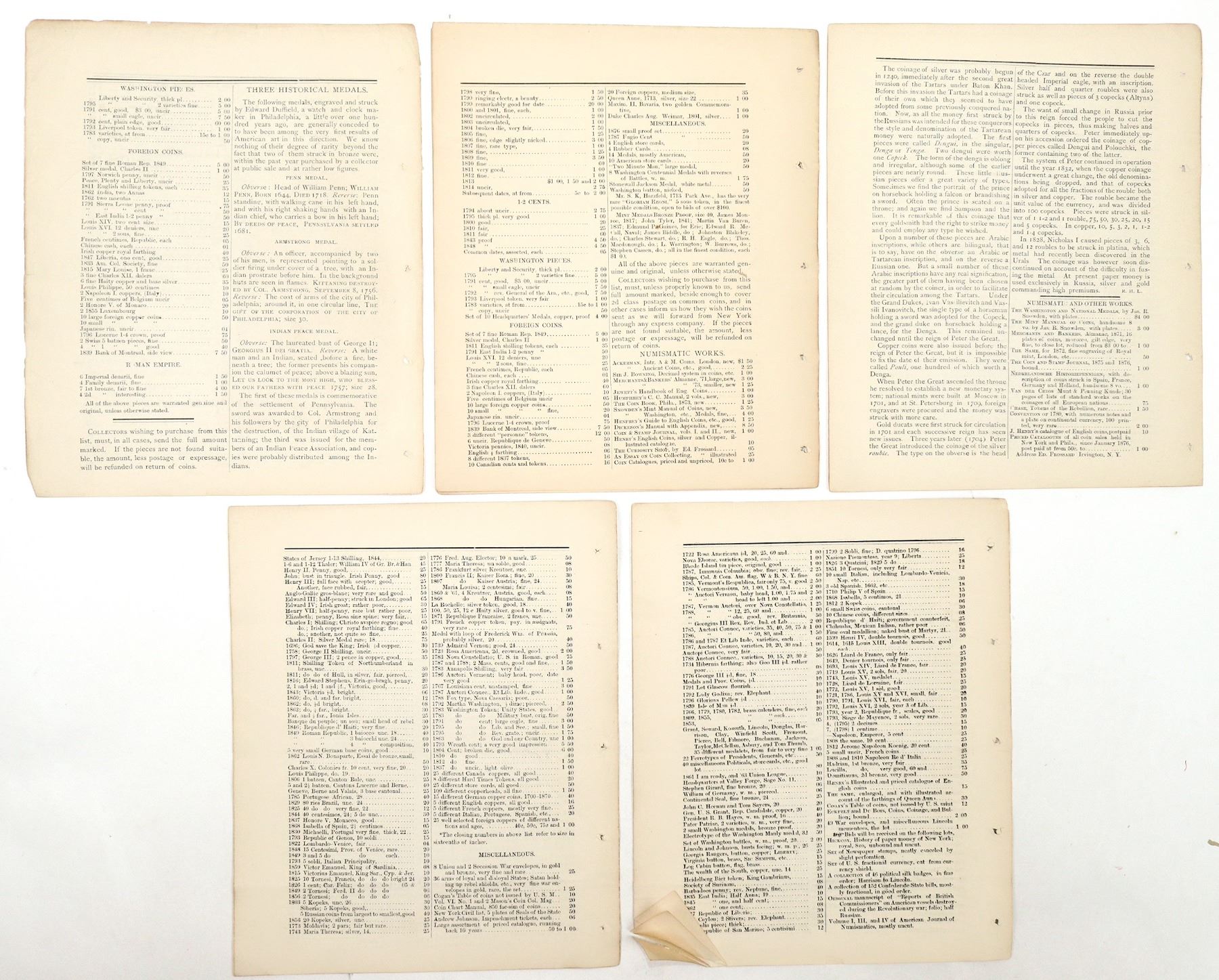 Published Bi Monthly by Ed Frossard of Irvington, New York. Issues from January, March, May, July and September of 1877. Articles, advertising, price lists, auction results. Fourteen years before the American Numismatic Association came into being. Four to eight pages per issue; 8 x 9 inches; loose pages. In 1875 Frossard became the first editor of J.W. Scott's Coin Collector's Journal, commuting to New York City from his Irvington-on-Hudson home. In 1877, he started in business on his own. From then until his passing in 1899, he issued Numisma (January 1877 to December 1891, comprising 59 issues), and created 160 auction catalogs.