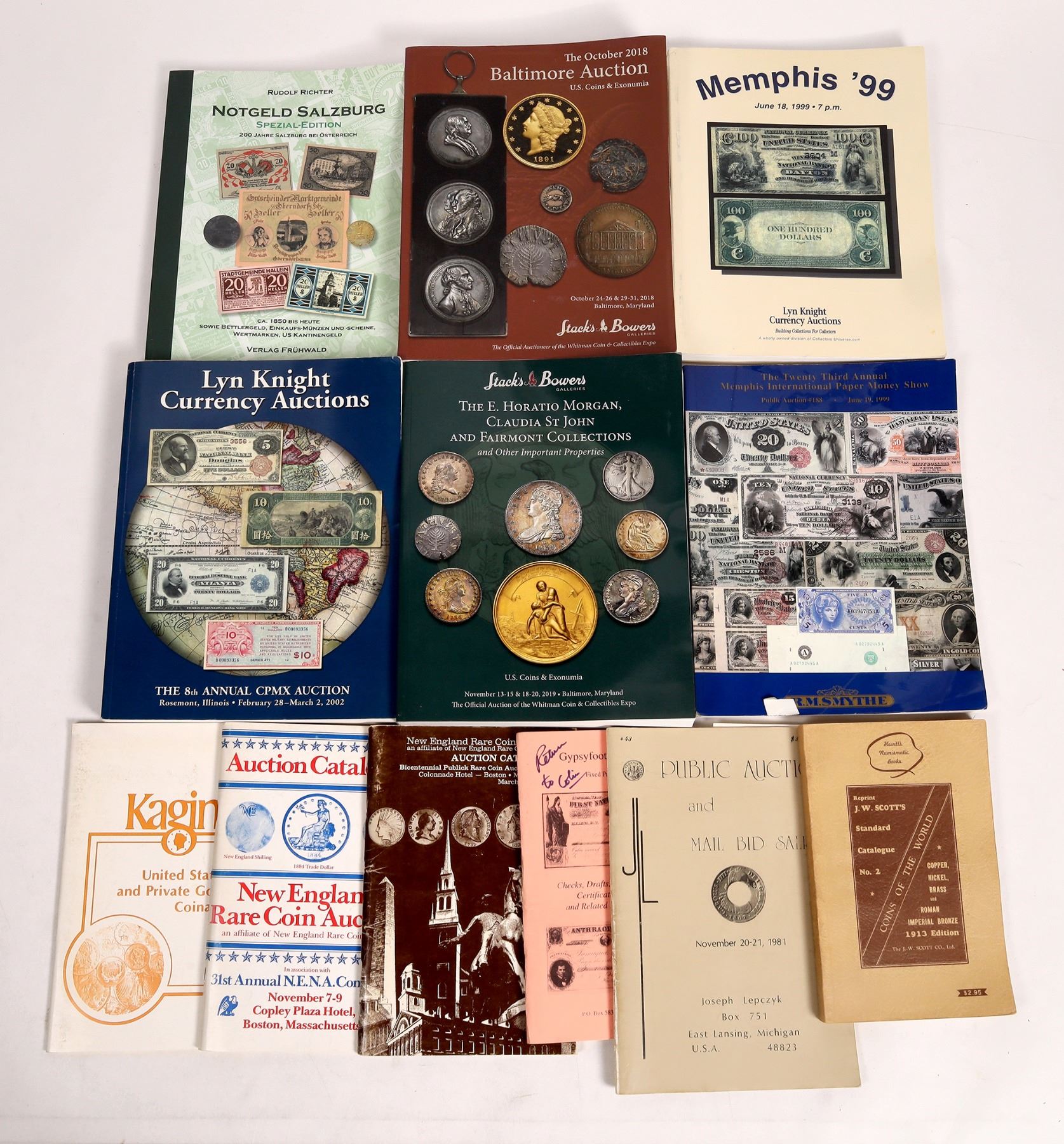 12 numismatic catalogs. R M Smythe, Memphis '99, Lyn Knight currency auction, Stacks Bowers 2019, New England Rare Coin Auctions etc.